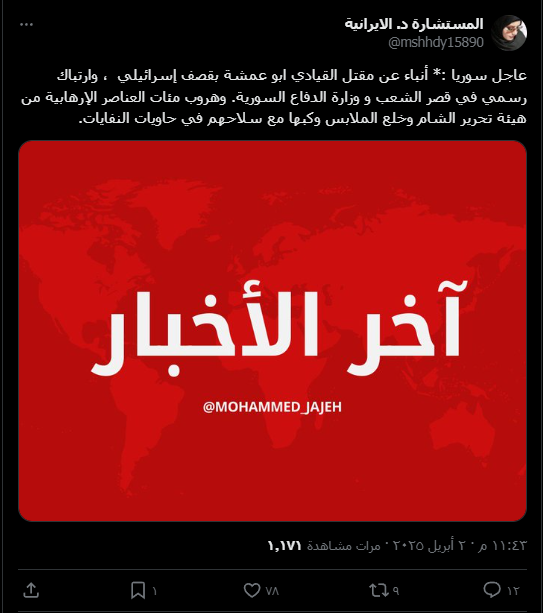 أنباء عن مقتل القيادي ابو عمشة بقصف إسرائيلي وارتباك رسمي في قصر الشعب و وزارة الدفاع السورية، وهروب مئات العناصر الإرهابية من هيئة تحرير الشام وخلع الملابس وكبها مع سلاحهم في حاويات النفايات.