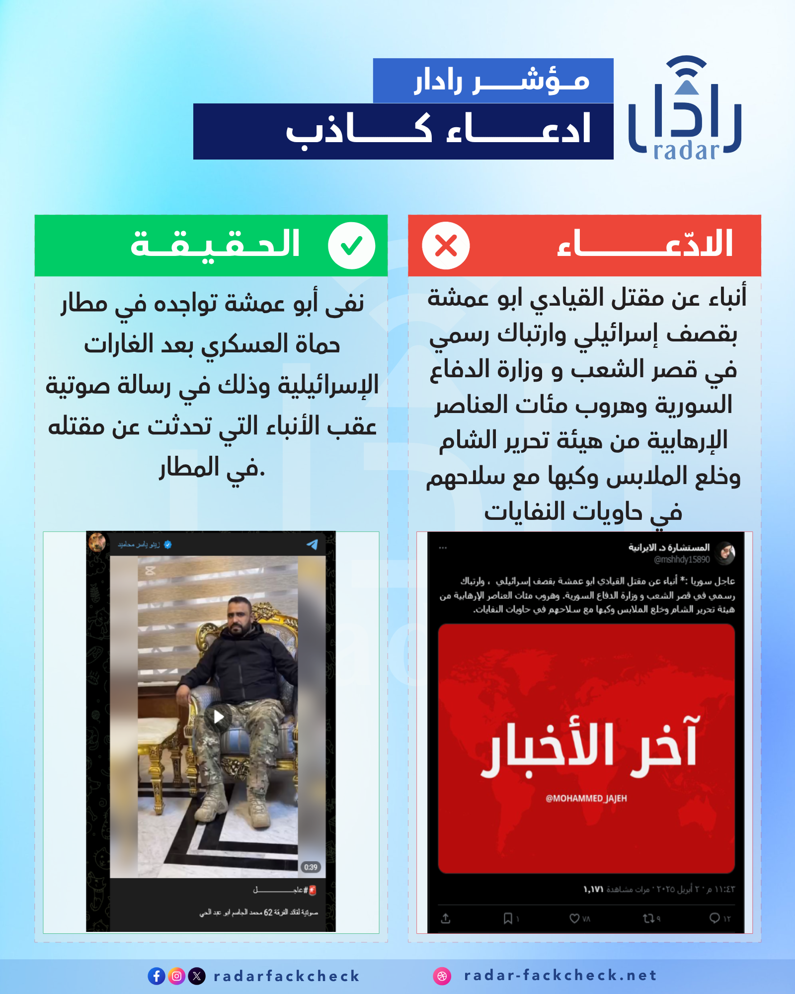 أجرى فريق منصة رادار بحثًا حول الأنباء المتداولة عن مقتل القيادي أبو عمشة، وتبين أنها غير صحيحة، إذ نفى أبو عمشة تواجده في المطار بعد استهدافه من خلال رسالة صوتية.