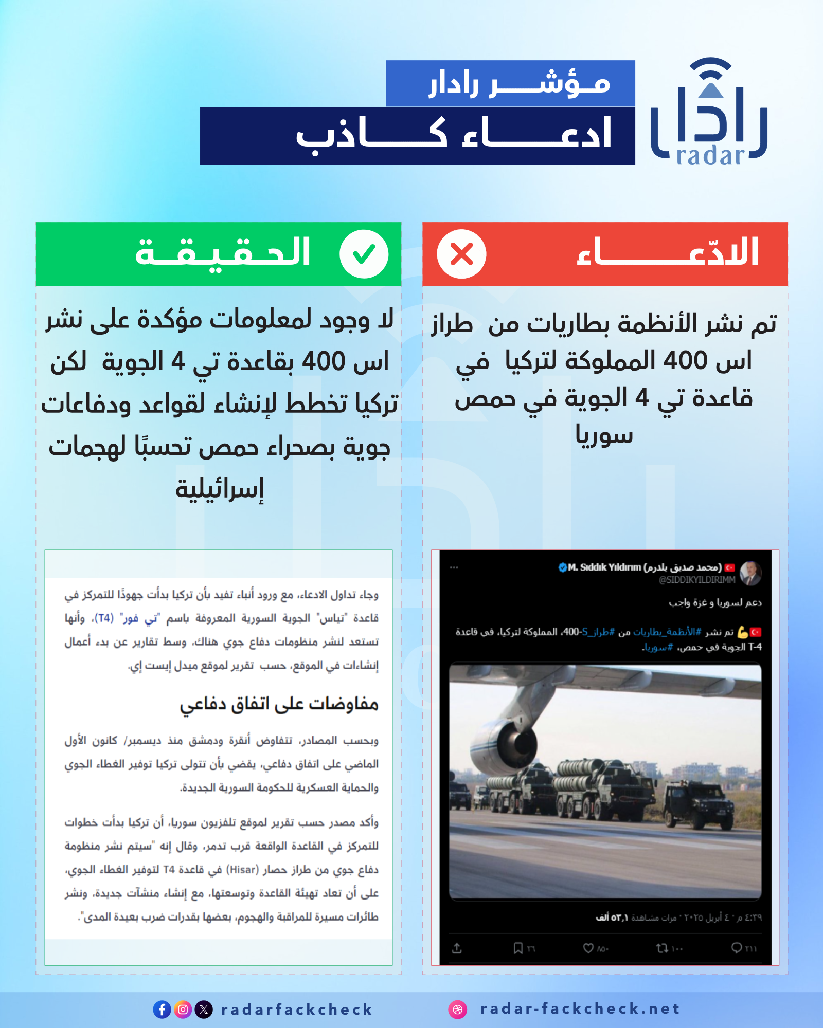 أجرى فريق منصة رادار بحثاً حول ادعاء نشر تركيا بطاريات اس 400 في مطار تي 4 العسكري، وتبين أنه لا توجد معلومات مؤكدة عن نشر تركيا لأنظمة S-400 في قاعدة T-4 الجوية بحمص، لكن مصادر متعددة تشير إلى أن أنقرة تخطط لتعزيز وجودها العسكري في سوريا ضمن اتفاق مع الإدارة الانتقالية، من خلال إنشاء قواعد في صحراء حمص وشمال دمشق، ونشر أنظمة دفاع جوي متقدمة كإجراء وقائي ضد الهجمات الإسرائيلية المتكررة.