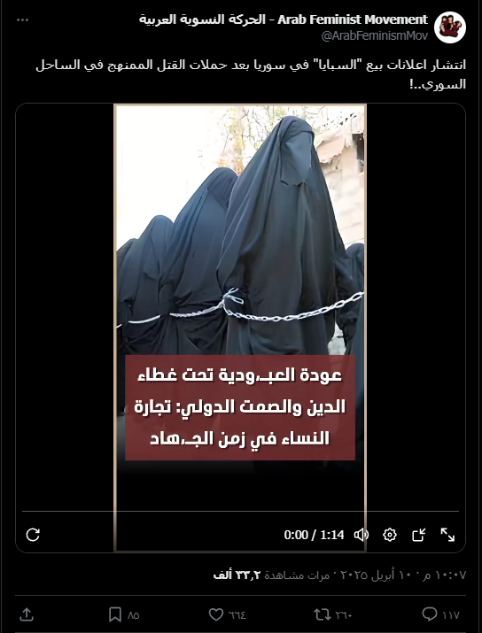 انتشر مقطع فيديو على منصة “إكس”، ادّعى ناشروه أن إعلانات بيع السبايا في سوريا بدأت بالانتشار عقب حملات قتل ممنهجة شهدها الساحل السوري، استهدفت نساءً من الطوائف الإيزيدية والمسيحية والعلوية. ووفقًا لما ورد في الفيديو، فإن النساء المختطفات نُقلن إلى محافظة إدلب، حيث يتم عرضهن للبيع.
