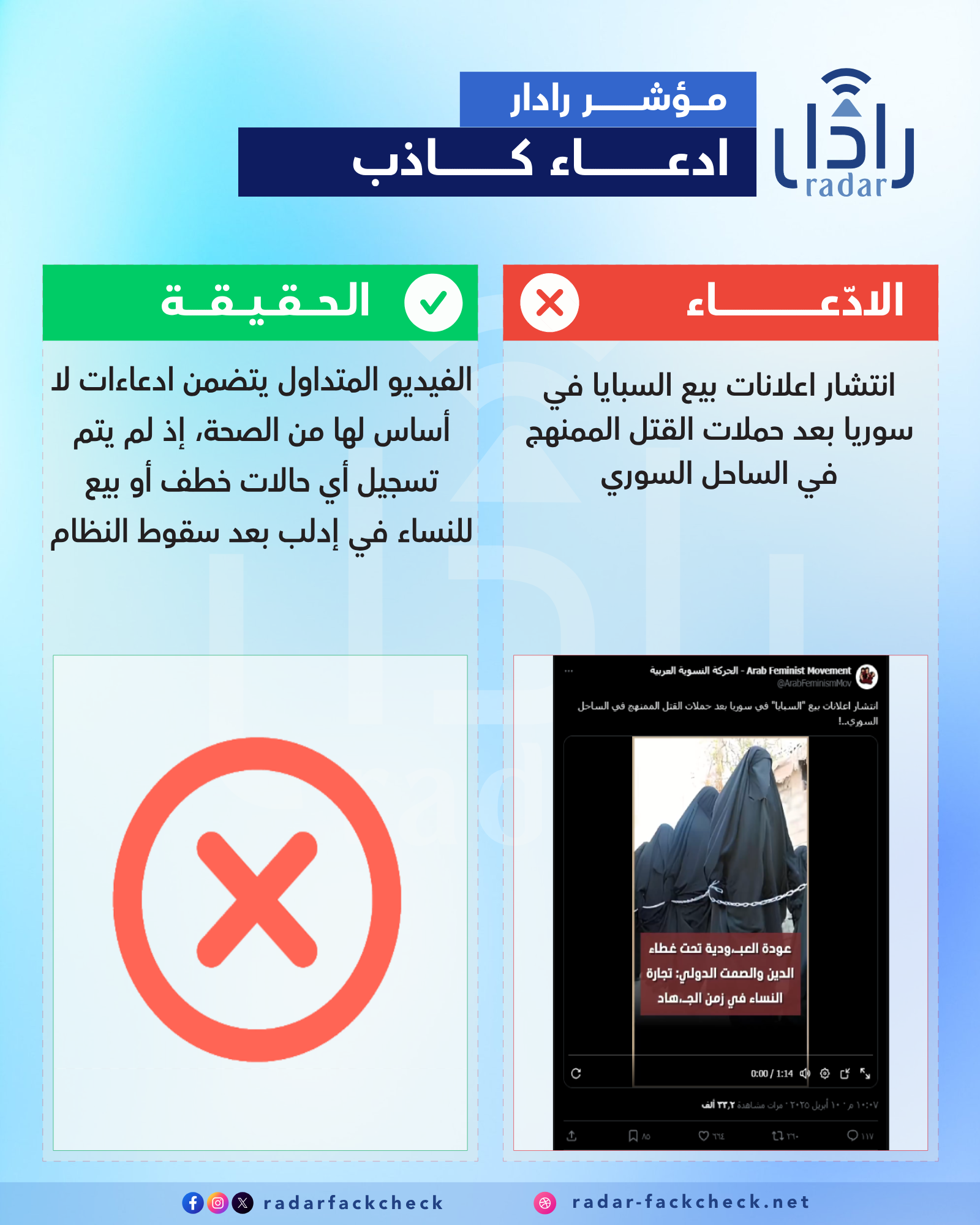 أجرى فريق منصة "رادار" بحثًا موسعًا للتحقق من صحة هذه الادعاءات، ولم يعثر على أي دليل يثبتها. كما تواصل الفريق مع عدد من المصادر المحلية في إدلب، والذين نفوا وقوع أي حوادث من هذا النوع.