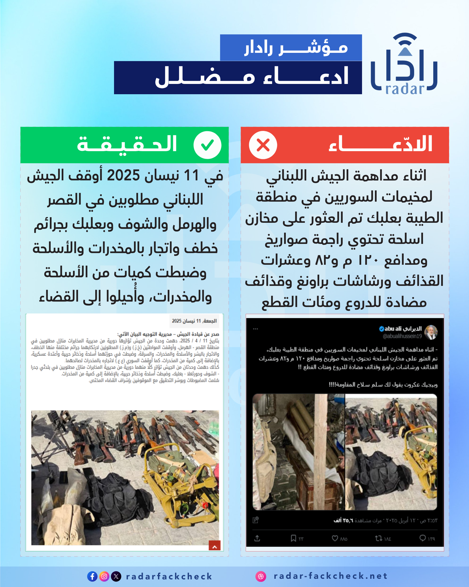 أجرى فريق منصة رادار تحققًا من الخبر والصور المتداولة حول العثور على أسلحة في مخيمات للسوريين في الطيبة – بعلبك، وتبيّن أنها تعود لمداهمات نفذها الجيش اللبناني ضد مطلوبين لبنانيين، وفق بيان رسمي صدر عنه بتاريخ 11 نيسان 2025. وأوضح البيان أن العملية أسفرت عن توقيف متورطين بجرائم خطف واتجار بالمخدرات والأسلحة، وضُبطت بحوزتهم كميات من الأسلحة والذخائر، فيما لا علاقة لمخيمات السوريين بالمضبوطات.