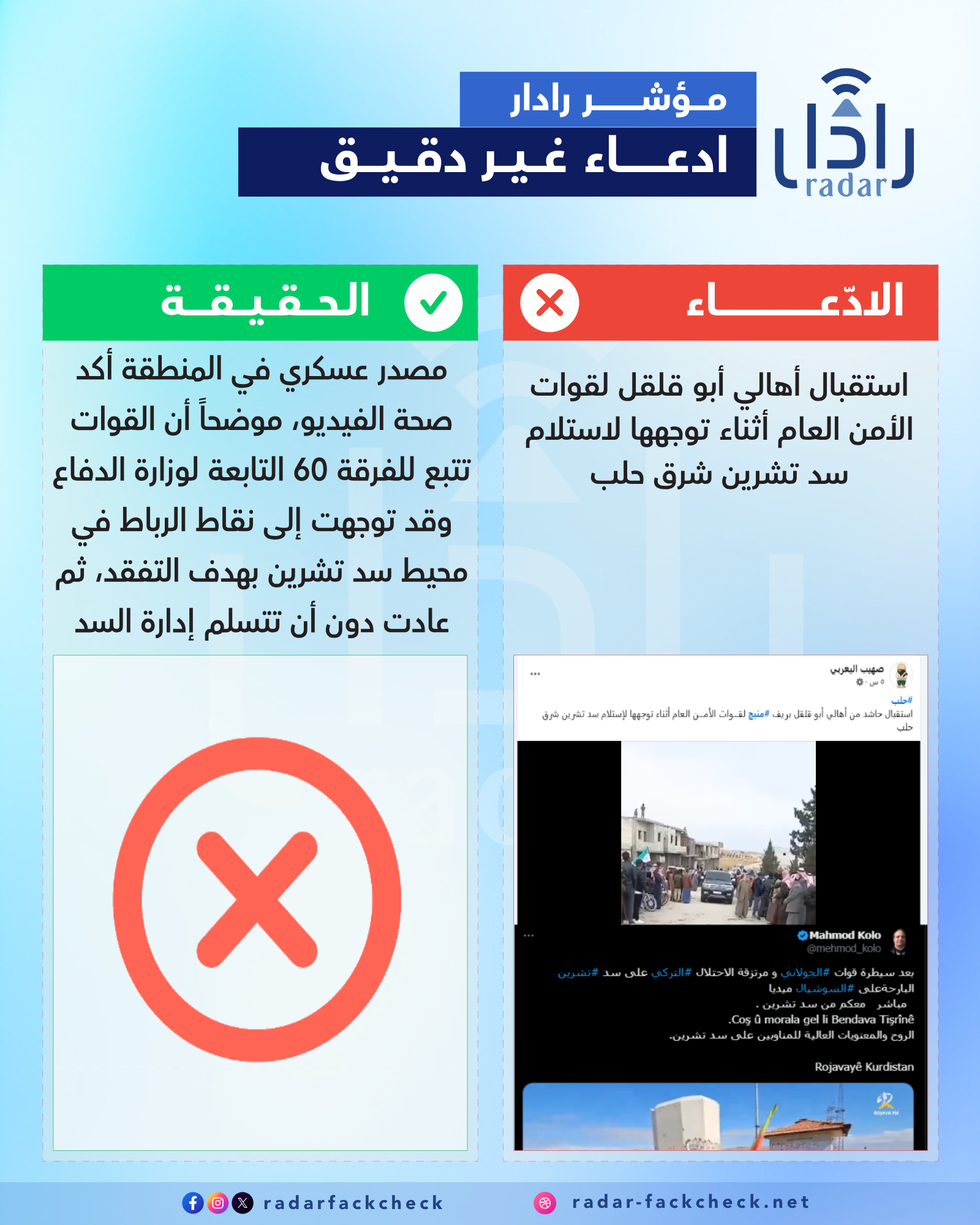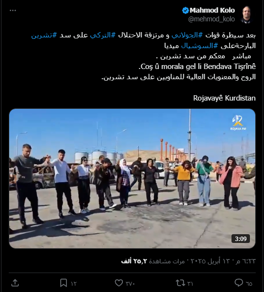 ويأتي هذا بالتوازي مع انتشار فيديو مصور أمس يظهر احتفال عدد من العاملين المناوبين في سد تشرين، بعد التحقق من مصدر الفيديو، تبيّن أنه نُشر على صفحة إذاعة “روج آفا إف إم”، تحت عنوان: