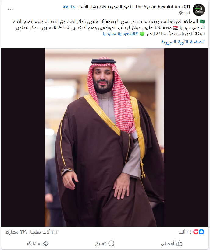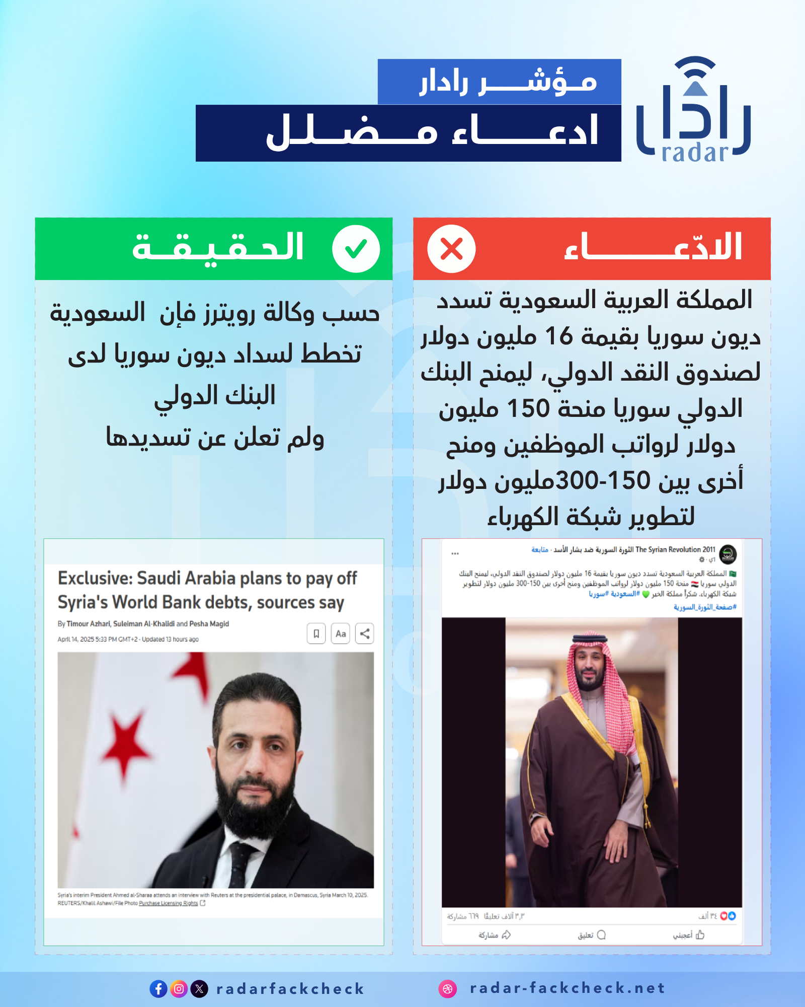 أجرى فريق منصة "رادار" تحقيقًا حول الادعاء المتداول بشأن تسديد المملكة العربية السعودية ديون سوريا، وتبيّن أن هذا الادعاء غير صحيح. وبحسب ما نقلته وكالة "رويترز" عن ثلاثة مصادر مطلعة، فإن السعودية تخطط لسداد ديون سوريا للبنك الدولي، في خطوة قد تمهد للموافقة على منح بملايين الدولارات مخصصة لإعادة الإعمار ودعم القطاع العام السوري المتعثر.