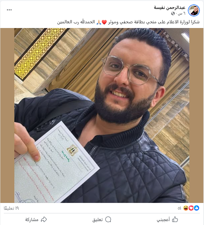 نشر الشاب عبد الرحمن نفيسة عبر صفحته الشخصية صورة له وهو يحمل ورقة كتب عليها "شكراً لوزارة الإعلام على منحي بطاقة صحفي ومؤثر".