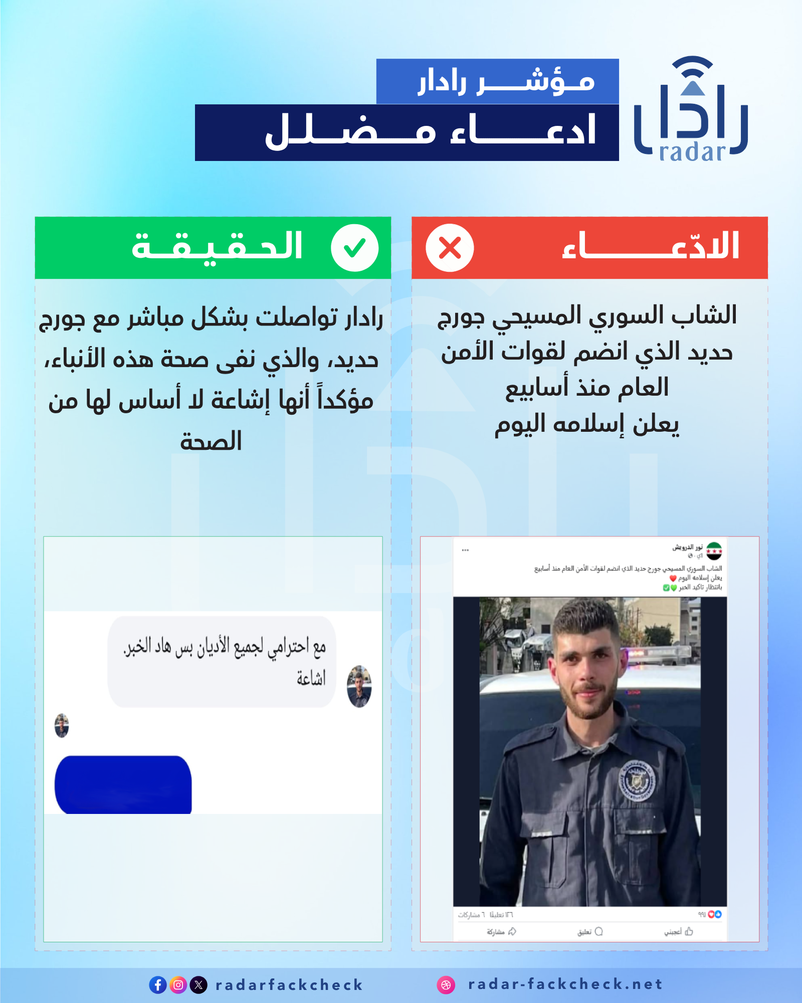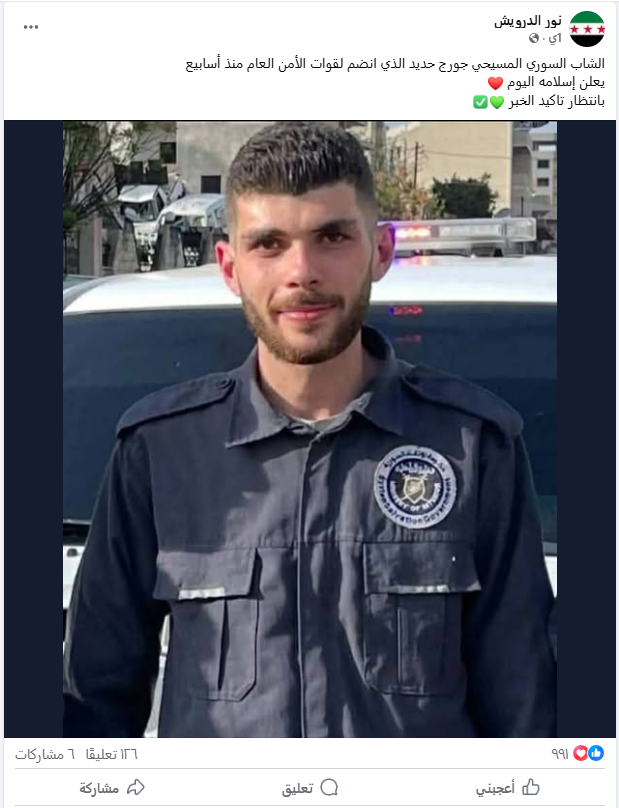 انتشر على وسائل التواصل الاجتماعي خلال الأيام الماضية خبر مفاده أن الشاب السوري المسيحي جورج حديد، الذي انضم مؤخراً إلى قوات الأمن العام، قد أعلن إسلامه.