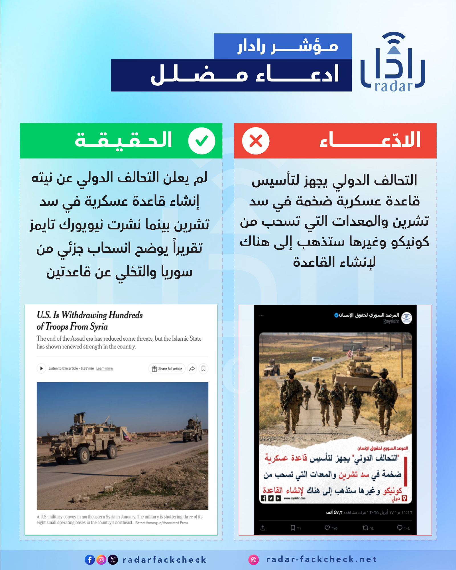أجرى فريق منصة رادار بحثاً حول صحة الادعاء، ولم يجد أي معلومات تؤكد صحة الادعاء من القيادة المركزية الأمريكية أو مواقع موثوقة أخرى، ومن جهة أخرى نشرت صحيفة نيويورك تايمز الأميركية، يكشف أن الانسحاب ليس موضعيًا أو جزئيًا كما ورد في تقارير محلية، بل هو جزء من خطة أوسع تشمل إغلاق ثلاث قواعد عسكرية أميركية في شمال شرق سوريا. وبحسب الصحيفة، فإن مسؤولين أميركيين رفيعي المستوى أكدوا أن الجيش الأميركي سيغلق ثلاثًا من قواعده التشغيلية الصغيرة الثماني، مما يؤدي إلى خفض عدد القوات من حوالي 2000 جندي إلى 1400 فقط.