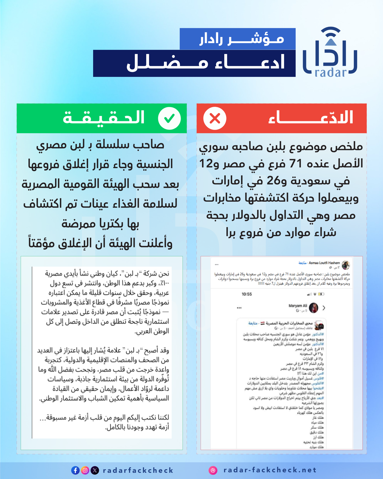 أجرى فريق منصة "رادار" بحثًا حول صحة الادعاء، ولم يجد أي معلومات تؤكد أن "بلبن" شركة سورية. وتشير المعلومات الرسمية إلى أن "بلبن" هي سلسلة مصرية متخصصة في تقديم الحلويات ومنتجات الألبان، تأسست في مصر عام 2021، ويملكها رجال أعمال مصريون، من أبرزهم مؤمن عادل. أما الادعاءات التي ربطت الشركة بالمال السوري، فمصدرها على الأرجح وجود عدد كبير من العاملين السوريين في بعض فروع "بلبن"، حيث أظهرت تقارير صحفية مصرية أن بعض الفروع يعمل فيها أكثر من 100 سوري. ومع ذلك، لا توجد أي دلائل تربط ملكية الشركة أو إدارتها بمستثمرين سوريين. وأعلنت الهيئة القومية المصرية لسلامة الغذاء إغلاق الشركة مؤقتاً بعد سحب عينات واكتشاف بها بكتريا ممرضة، لحين توفيق الأوضاع.