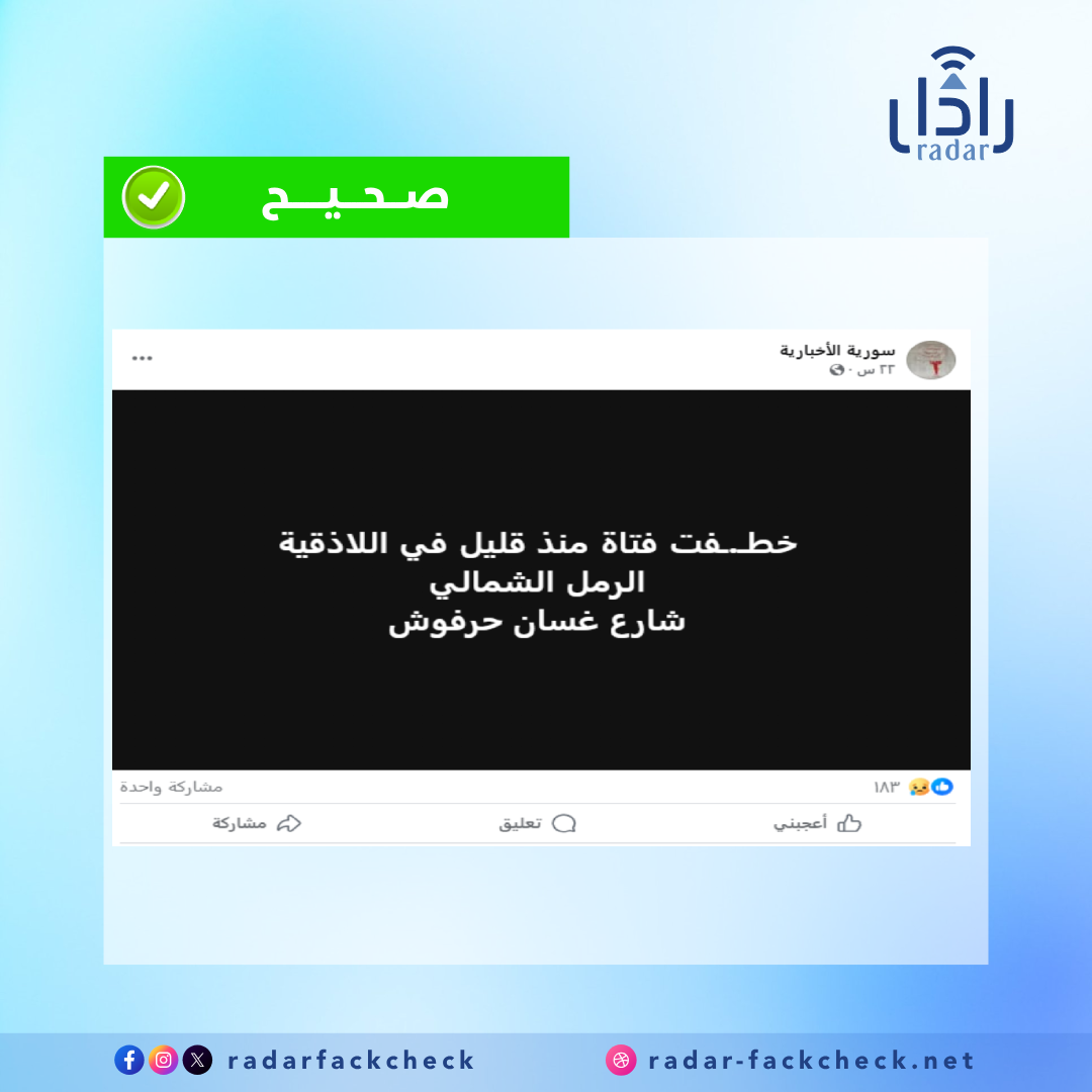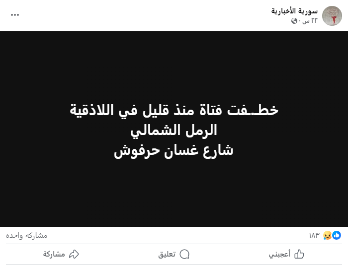تداول ناشطون على مواقع التواصل الاجتماعي خبرًا عن تعرض الطالبة سارة سعد الدين (14 عامًا) لمحاولة اختطاف في شارع غسان حرفوش بمدينة اللاذقية، يوم الأحد.
