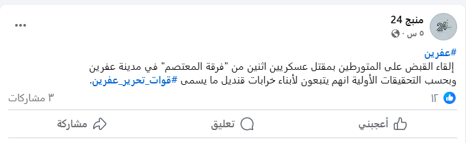 بعد مقتل عنصرين من الجيش العربي السوري في عفرين تداولت بعض الحسابات منشورات تتهم قسد بالتورط في الجريمة وأن المرتكبين ينتمون لمجموعة تدعى قوات تحرير عفرين