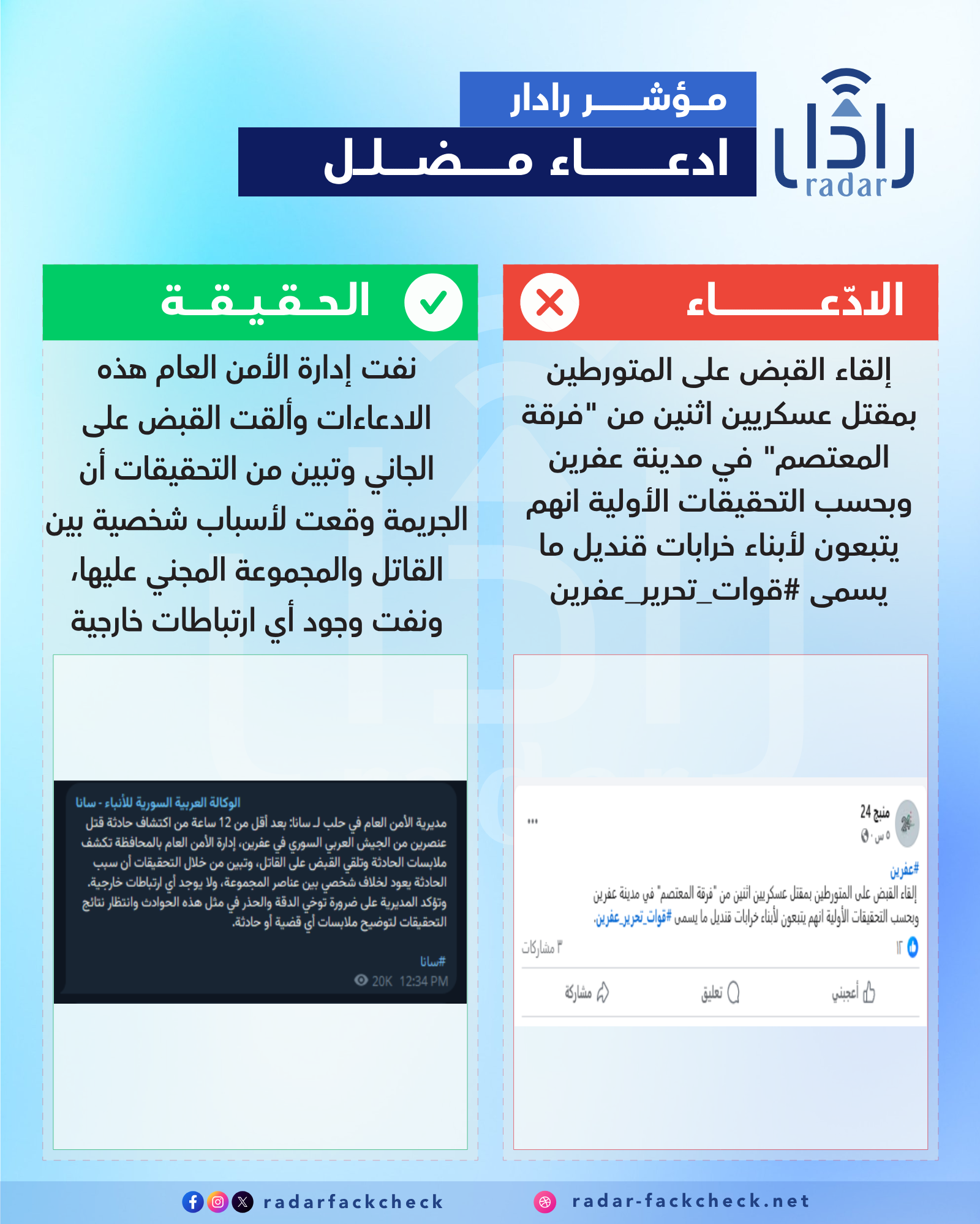 أجرى فريق منصة رادار تدقيقاً للخبر المتداول، ووجد أنه نفت إدارة الأمن العام هذه الادعاءات وأكدت أنها ألقت القبض على الجاني وتبين من خلال التحقيقات أن الجريمة وقعت لأسباب شخصية بين القاتل والمجموعة المجني عليها، ونفت الإدارة وجود أي ارتباطات خارجية في الحادثة