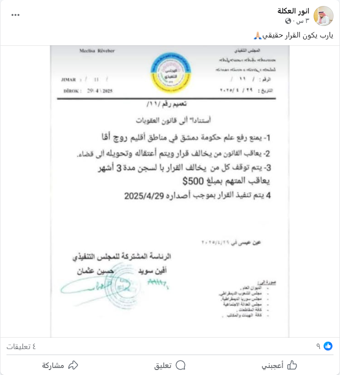انتشر على موقع فيس بوك صورة لتعميم ادعى ناشروه أن الادارة الذاتية لقسد أصدرته، ويقضي التعميم بفرض عقوبات على كل من يرفع علم حكومة دمشق في مناطق “روج افا” بالسجن ثلاث أشهر وغرامة 500 دولار.