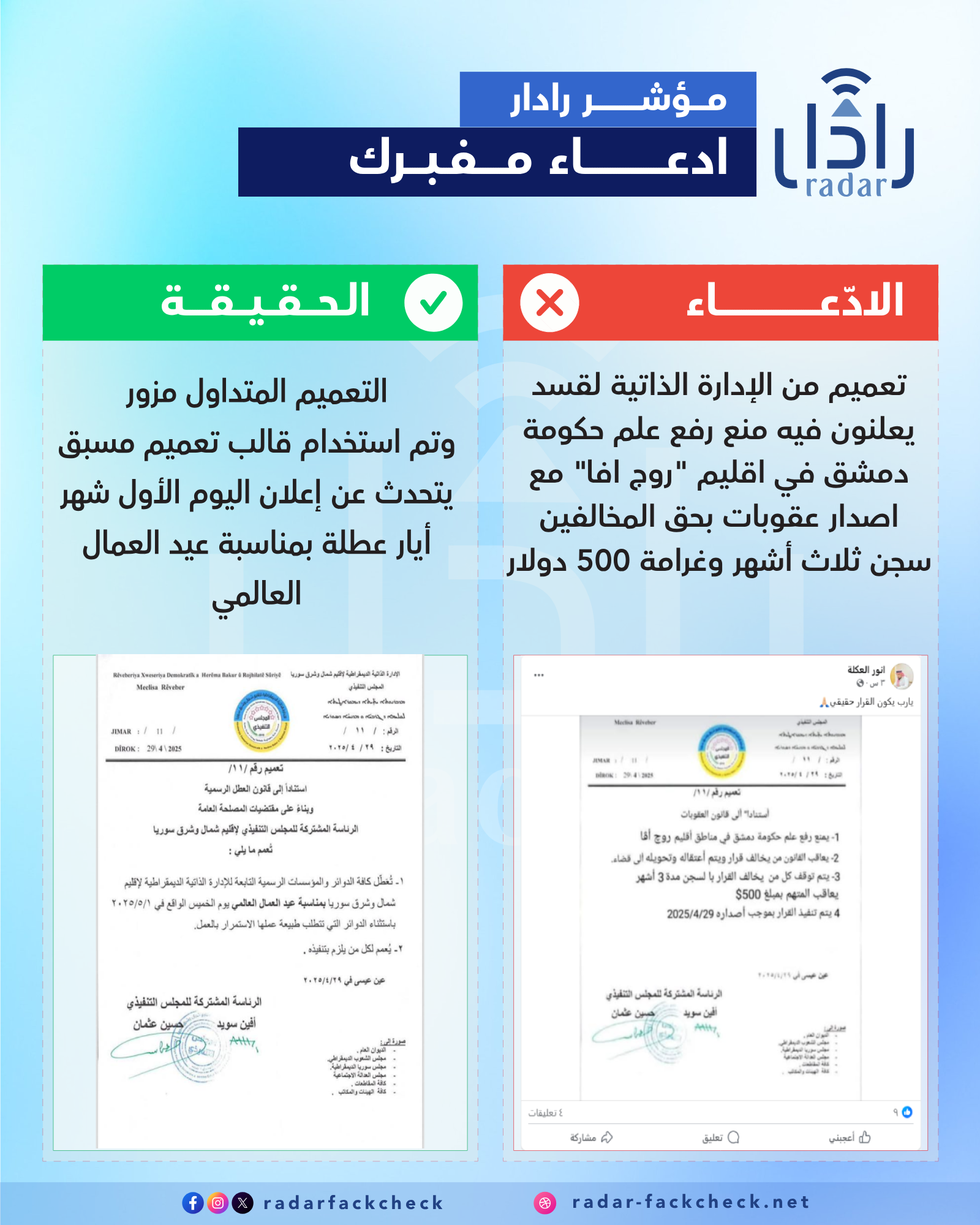 أجرى فريق منة رادار تدقيقاً للتعميم المتداول، بعد تعذر العثور على ذات التعميم في معرفات الادارة الذاتية الرسمية على مواقع التوصل الاجتماعي، وتبين أن التعميم مفبرك، حيث تم استخدام تعميم سابق واجراء تعديلات عليه، وهي واضحة من خلال اختلاف حجم ونوع الخطوط في ذات التعميم.
