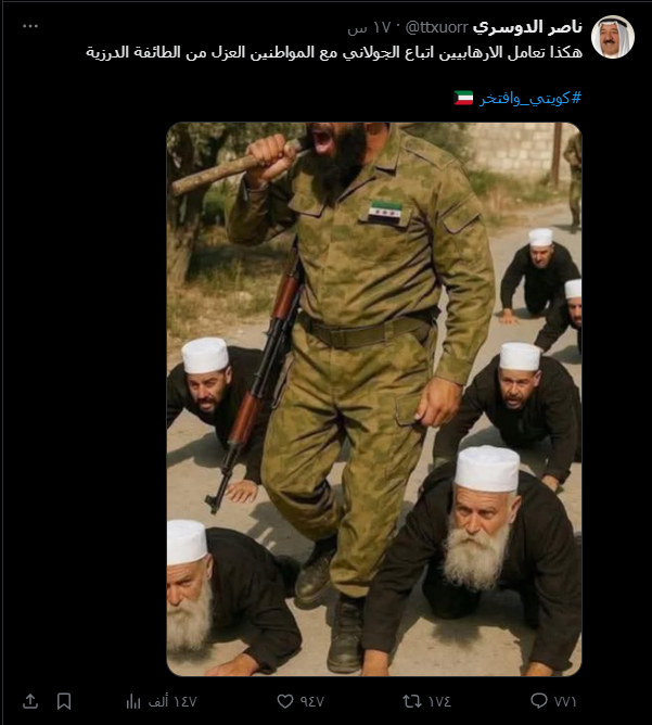 تُتداول على وسائل التواصل الاجتماعي صورة تُظهر مشايخ دروز يُفترض أنهم يتعرضون للإهانة على يد عناصر من الأمن العام، مع تعليق يدّعي: “هكذا يعامل إرهابيو الجولاني المواطنين العزّل من الطائفة الدرزية”.