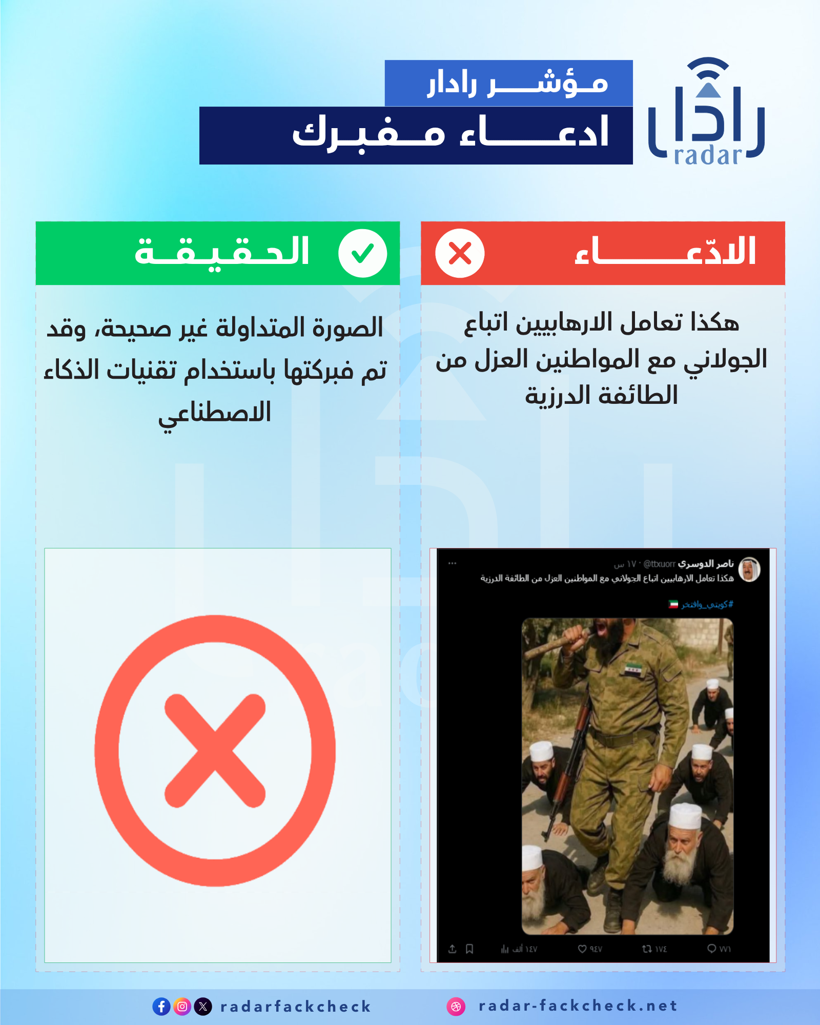 أجرى فريق منصة رادار تدقيقًا للصورة المتداولة التي تظهر مشايخ دروز يتعرضون للإهانة على يد عناصر من الأمن العام، وتبيّن أنها مفبركة باستخدام تقنيات الذكاء الاصطناعي.