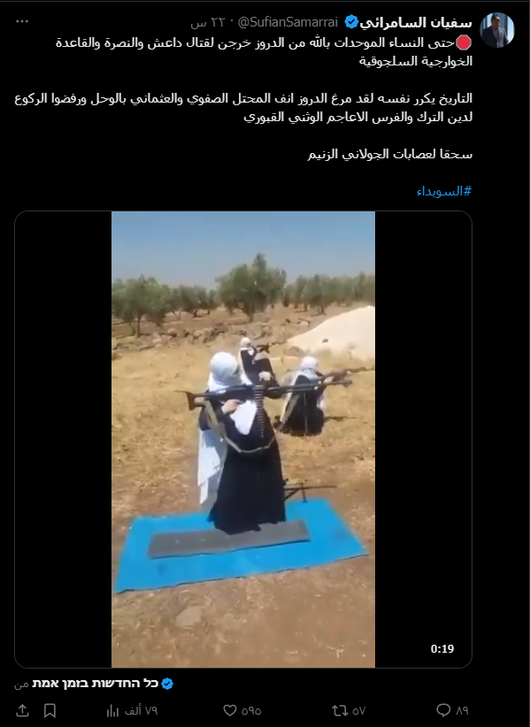نشرت حسابات عربية وإسرائيلية على منصة “إكس” مقطع فيديو كُتب عليه: “حتى النساء الموحّدات بالله من الدروز خرجن لقتال داعش، والنصرة، والقاعدة الخوارجية السلجوقية.