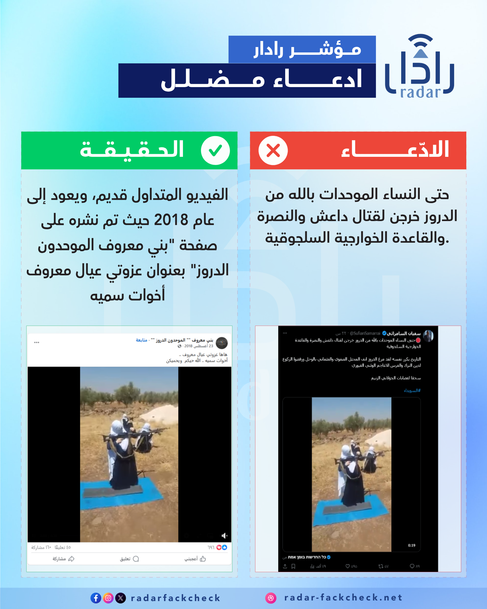 أجرى فريق منصة "رادار" تدقيقًا للفيديو المتداول، وتبيّن أنه قديم، ويعود إلى عام 2018، حيث نُشر آنذاك على صفحة "بني معروف الموحِّدون الدروز" تحت عنوان: "عزوتي عيال معروف... أخوات سمية".