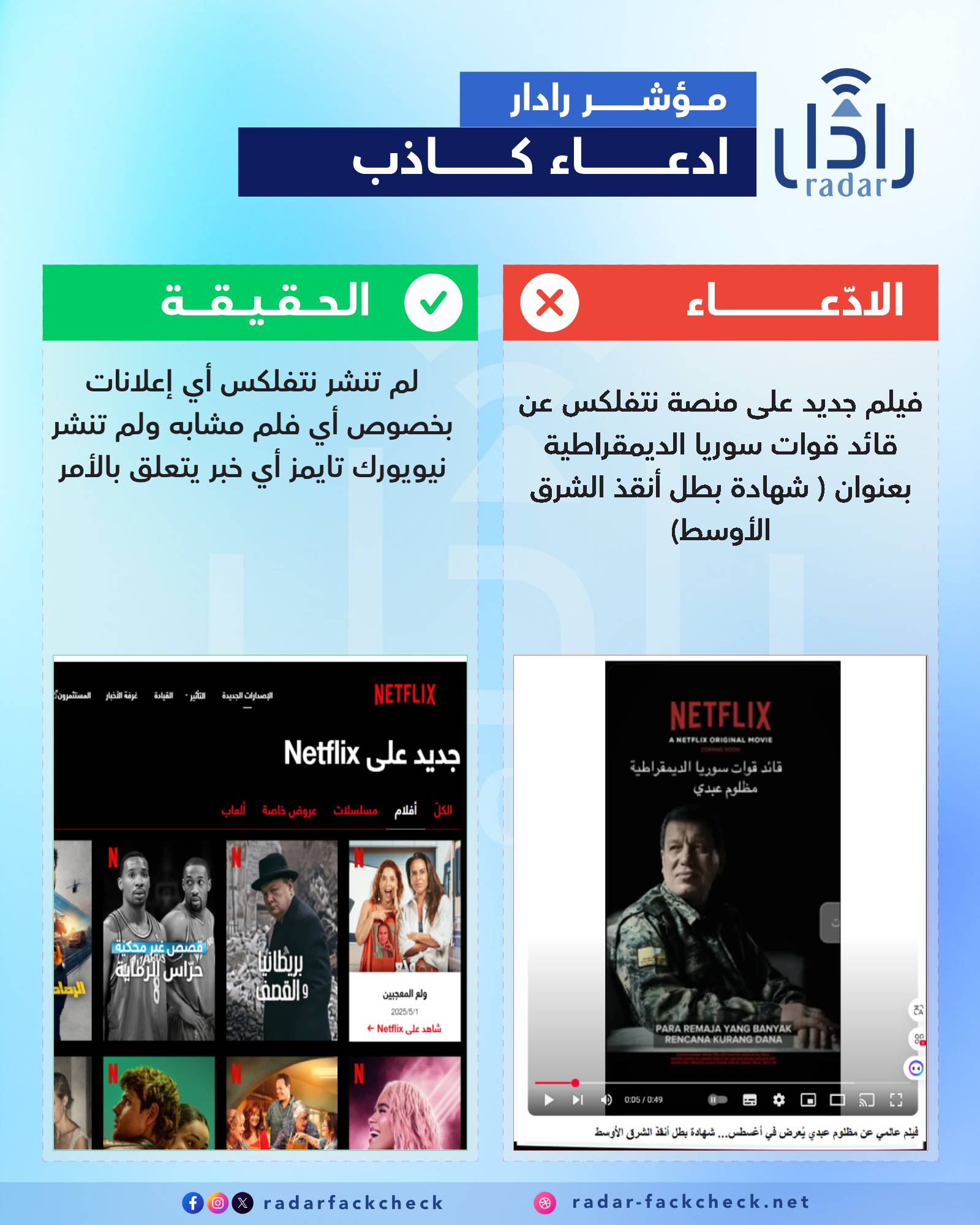 ادعت حسابات كردية على منصات فيسبوك وإكس ويوتيوب أن منصة الأفلام والمسلسلات الشهيرة “نتفلكس” ستعرض فلما عن قائد قوات سوريا الديمقراطية بعنوان “شهادة رجل أنقذ الشرق الأوسط” في أول أغسطس المقبل.
