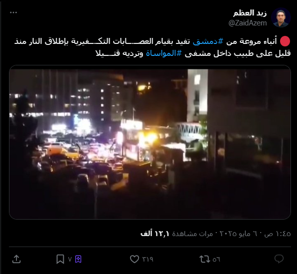 ادعى ناشطون على وسائل التواصل الاجتماعي أن مسلحين تابعين للسلطات السورية اقثحموا مشفى المواساة في دمشق، مما أدى إلى مقتل أحد الأطباء.