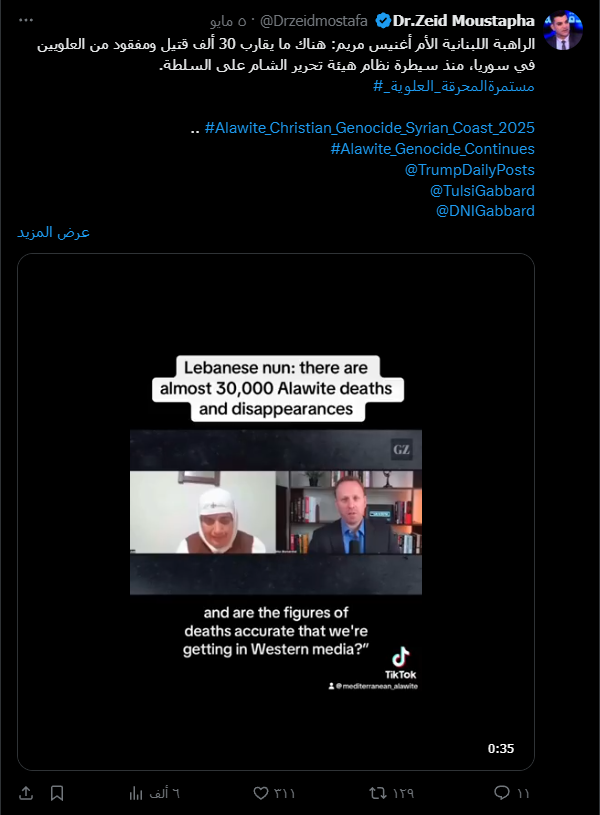 ادعت الراهبة اللبنانية الأم أغنيس مريم، في لقاء أجرته مع The Grayzone، أن عدد القتلى والمفقودين في الساحل السوري بلغ نحو 30 ألف شخص.