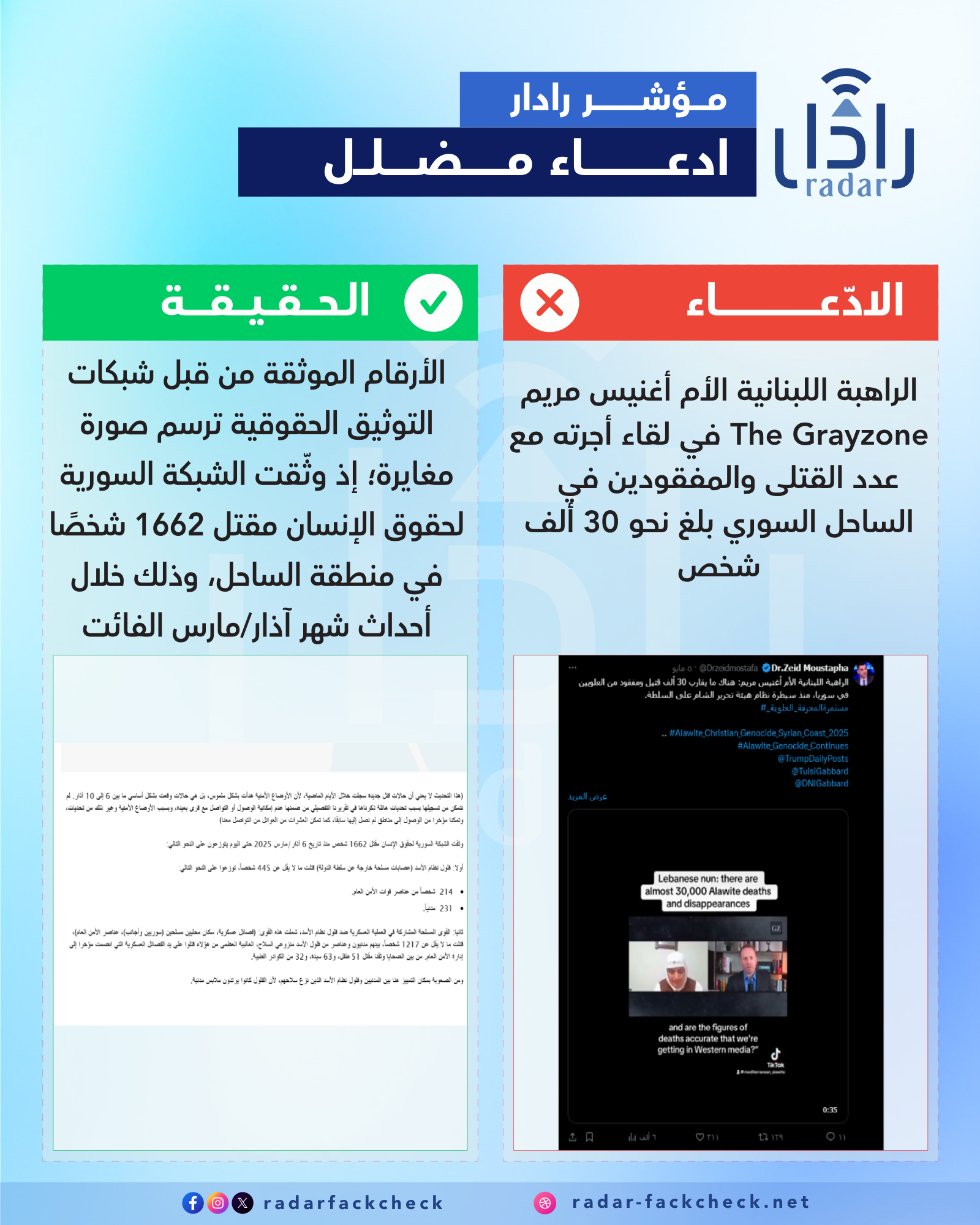 بحثنا في منصة رادار عن صحة الأرقام ووجدنا، أن الأرقام الموثقة من قبل شبكات التوثيق الحقوقية ترسم صورة مغايرة؛ إذ وثّقت الشبكة السورية لحقوق الإنسان مقتل 1662 شخصاً في سوريا منذ 6 آذار/مارس 2025 وحتى اليوم. وبحسب التقرير، قُتل ما لا يقل عن 445 شخصاً على يد فلول نظام الأسد، التي وصفتها الشبكة بعصابات مسلحة خارجة عن سلطة الدولة. وقد توزع الضحايا بين 214 عنصراً من قوات الأمن العام و231 مدنياً. وأشارت الشبكة إلى أن هذه الحصيلة لا تشمل القتلى من فلول نظام الأسد (العصابات الخارجة عن سلطة الدولة) الذين قُتلوا أثناء الاشتباكات، حيث لا يُعد ذلك انتهاكاً للقانون.