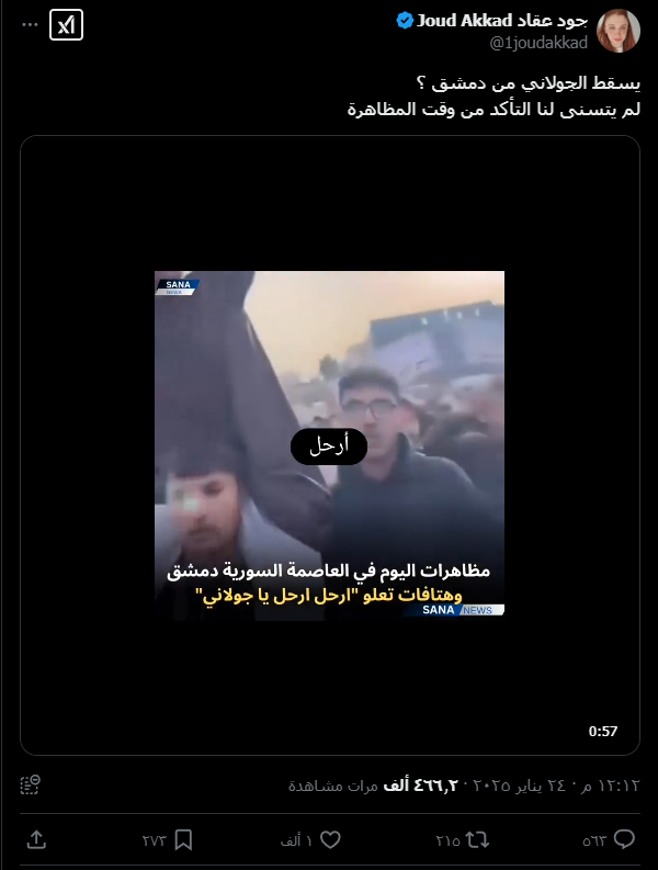 ادعت حسابات على منصة اكس، خروج مظاهرة في ساحة الامويين بدمشق تطالب باسقاط قائد الادارة السورية الجديدة.