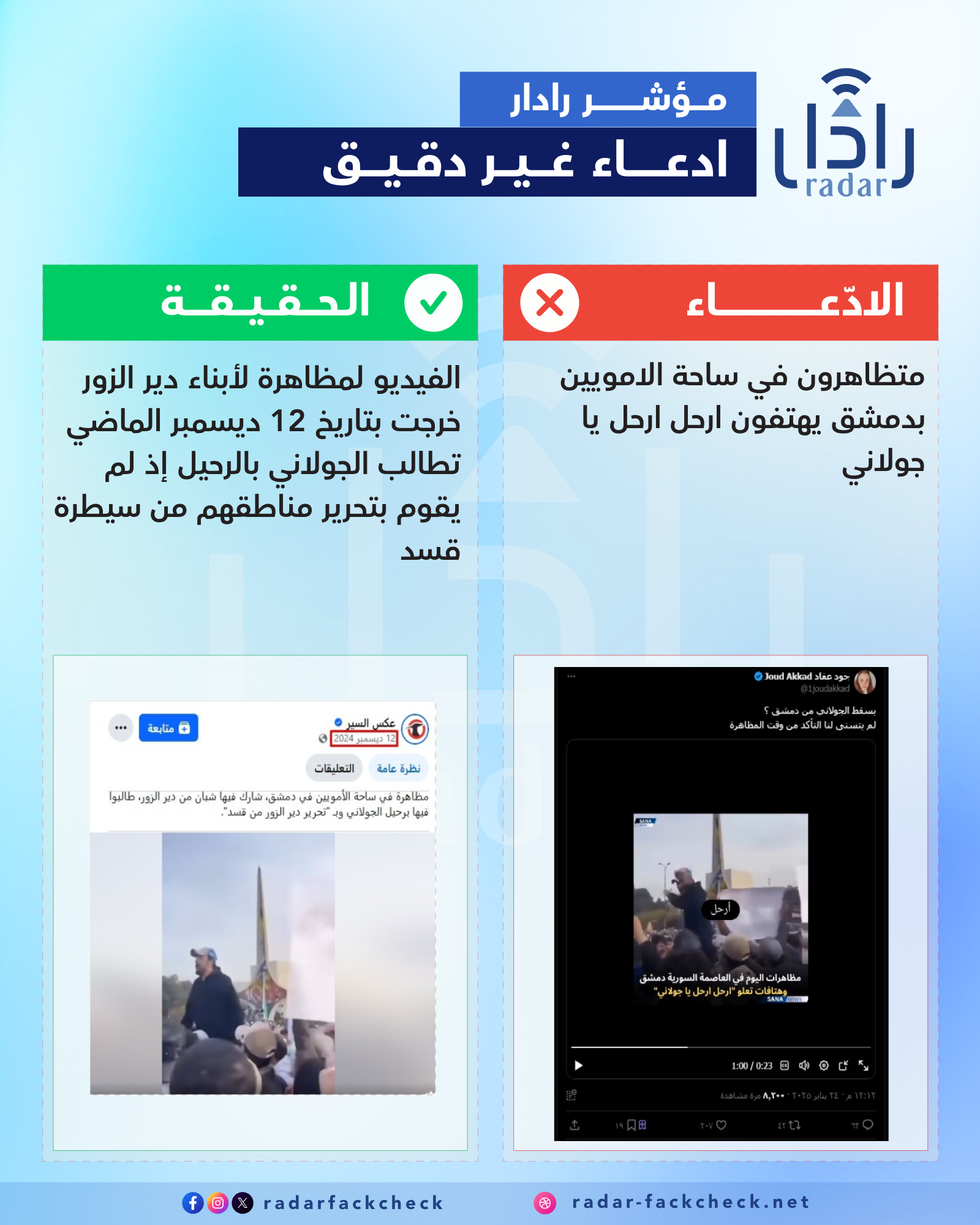 تحققنا من الفيديو في منصة رادار، وتبين أنه قديم منذ 12 ديسمبر 2024 لأبناء مدينة دير الزور خرجوا بمظاهرة تطالب الحكومة الجديدة بتحرير أراضيهم من سيطرة قوات سوريا الديمقراطية. وهتفوا "ارحل ارحل يا جولاني ما دام الدير بكوباني" في اشارة بمطالبته بالرحيل اذا لم يحرر مناطقهم.