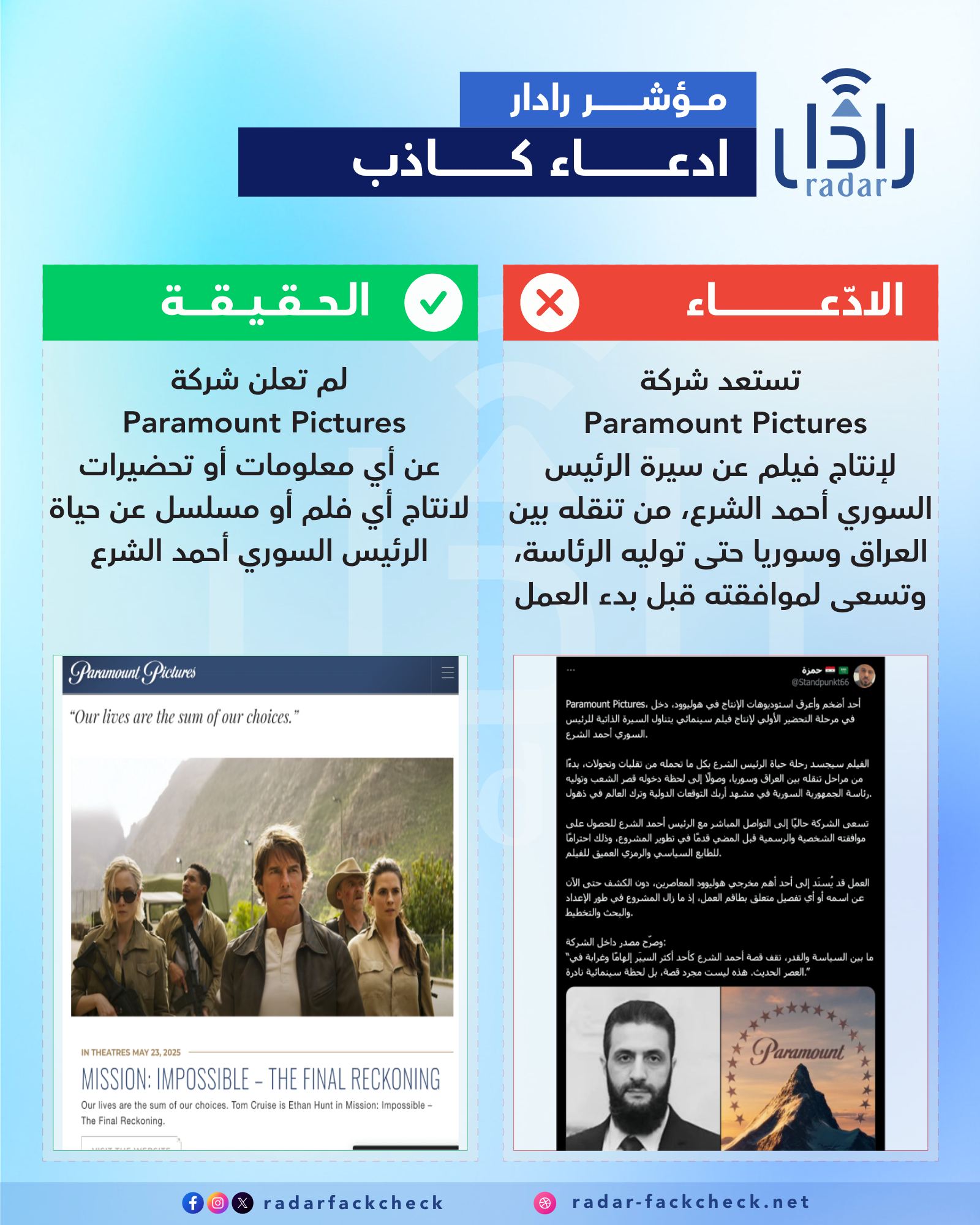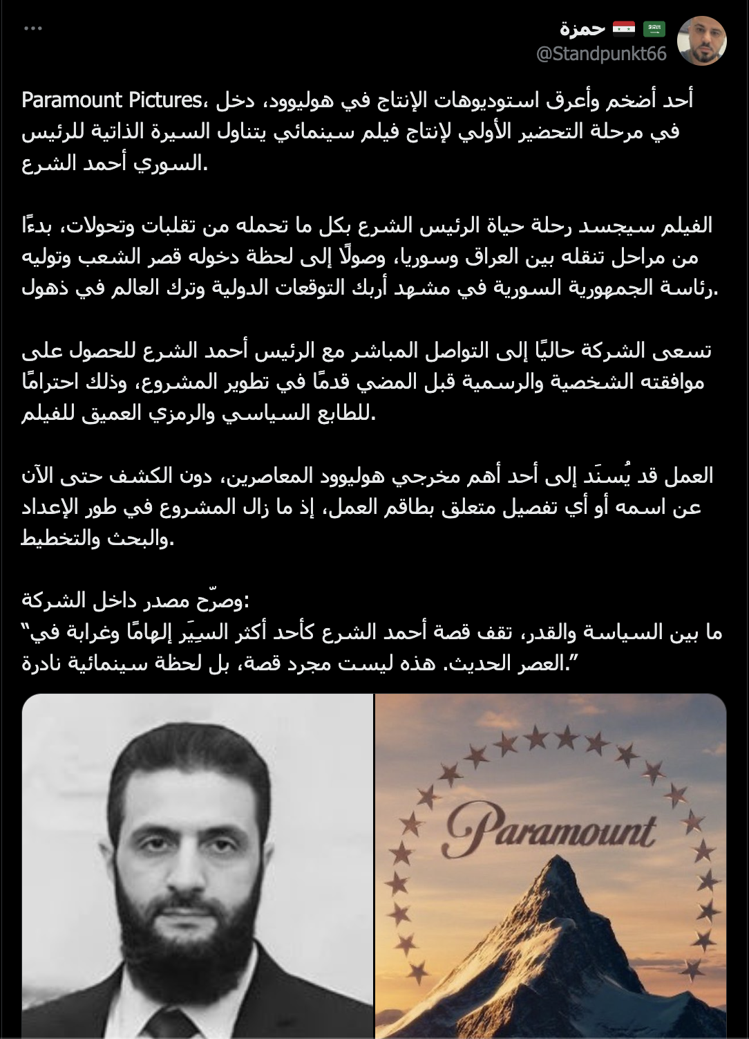 تداول ناشطون على مواقع التواصل الاجتماعي خبرًا مفاده أن شركة الإنتاج العالمية Paramount Pictures بدأت التحضيرات الأولية لإنتاج فيلم سينمائي يتناول السيرة الذاتية للرئيس السوري أحمد الشرع.