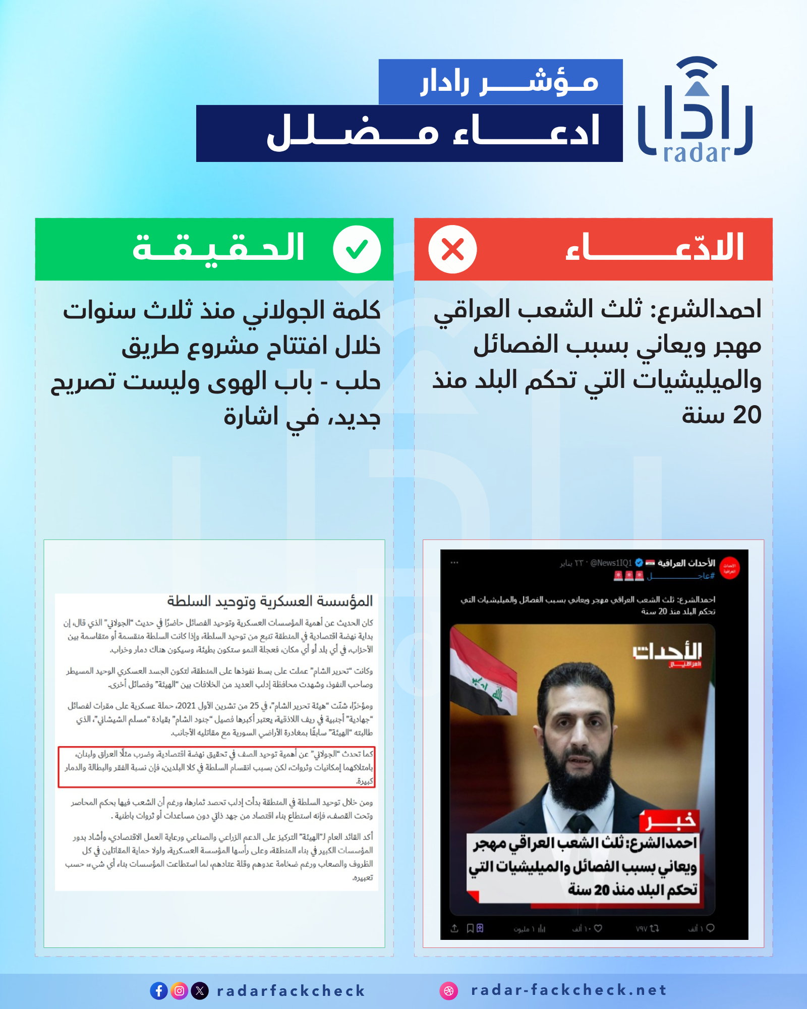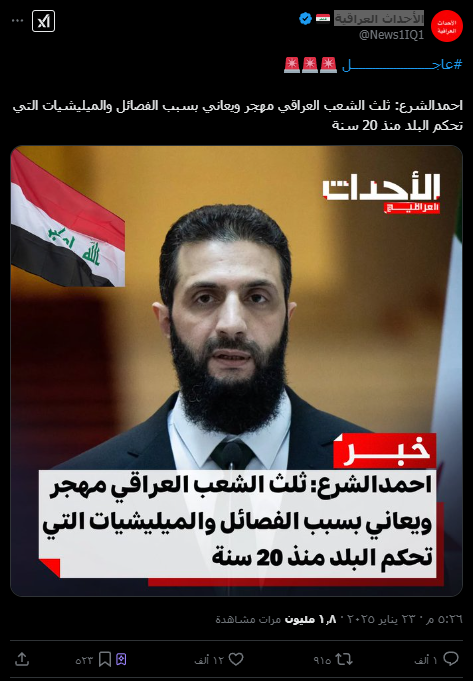 ينتشر فيديو تتداوله حسابات على منصة إكس، ادعت أنه لتصريح أدلى به حديثًا قائد الإدارة السورية الجديدة، أحمد الشرع، قال فيه أن ثلث شعب العراق مهجّر ويعاني بسبب الفصائل المسلحة في البلاد.