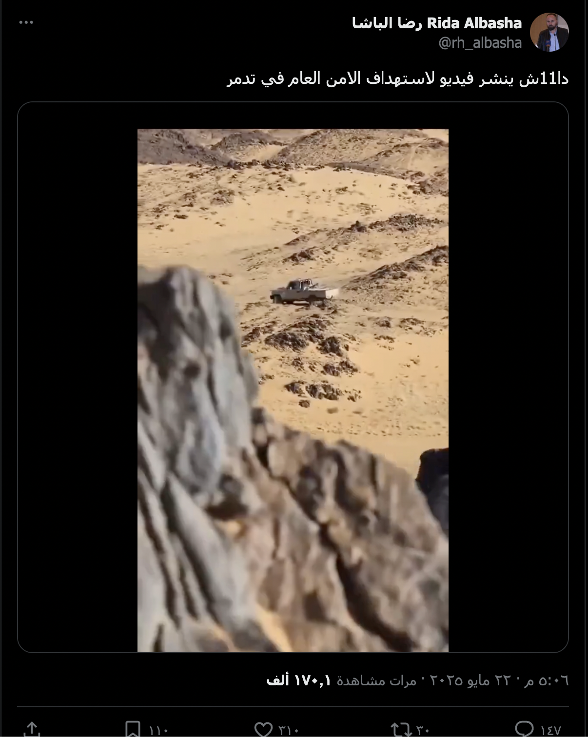 نشرت حسابات على منصة إكس مقطع فيديو، قالت فيه أنه لاستهداف تنظيم داعش لعناصر الأمن العام السوري في مدينة تدمر شرقي محافظة حمص.