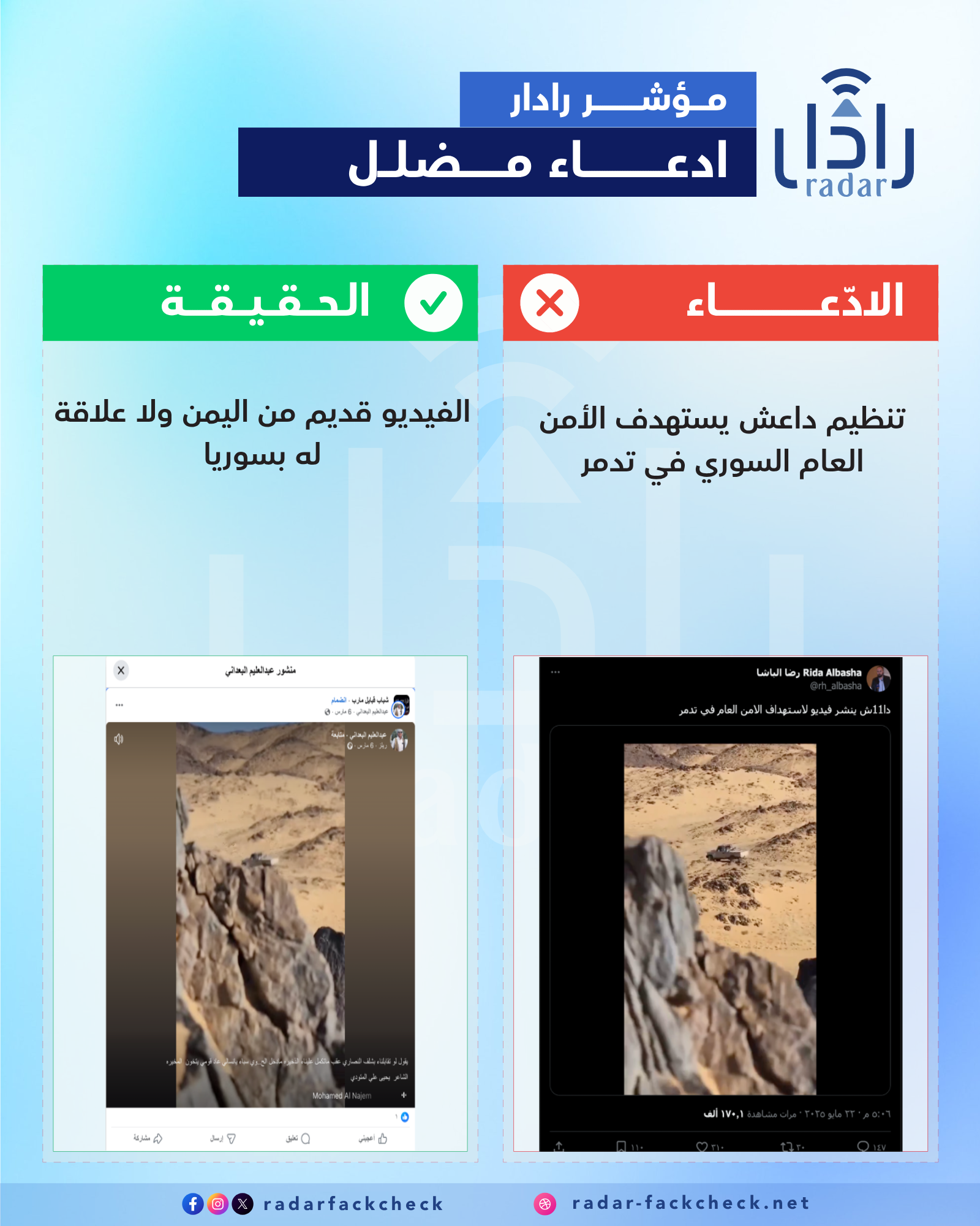 فريق رادار تحقق من الفيديو من خلال البحث العكسي، ومتابعة جميع الفيديوهات، وتبين أنها من اليمن وليست في تدمر، ونشرت تحت عنوان "يقول لو تقابلناء بشلف النصاري عقب ماتكمل عليناء الذخيره مادخل الح..وي سباء يانسالي عاد قومي يتخون المخيره الشاعر يحيى علي المتودي"