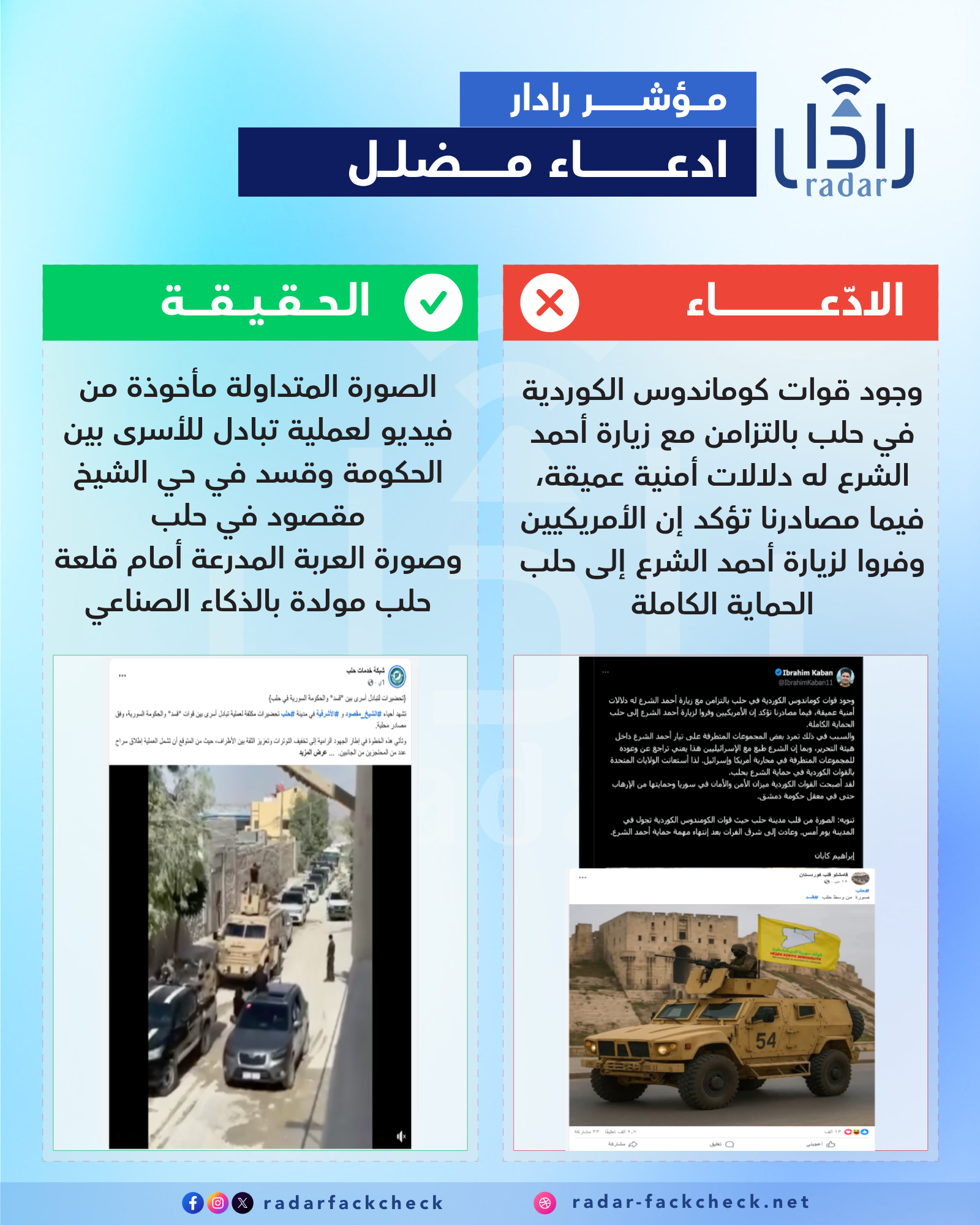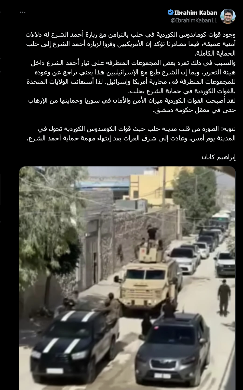 في سياق متصل، نشر الناشط الكردي الموالي لـ “قوات سوريا الديمقراطية”، إبراهيم كابان، عبر حسابه في منصة “إكس”، الصورة ذاتها بتاريخ 29/05/2025، زاعمًا أن قوات الكوماندوس الكردية تواجدت في حلب بالتزامن مع زيارة أحمد الشرع، معتبرًا أن “القوات الكردية باتت تمثل ميزان الأمن والاستقرار في سوريا، حتى داخل معاقل حكومة دمشق”.