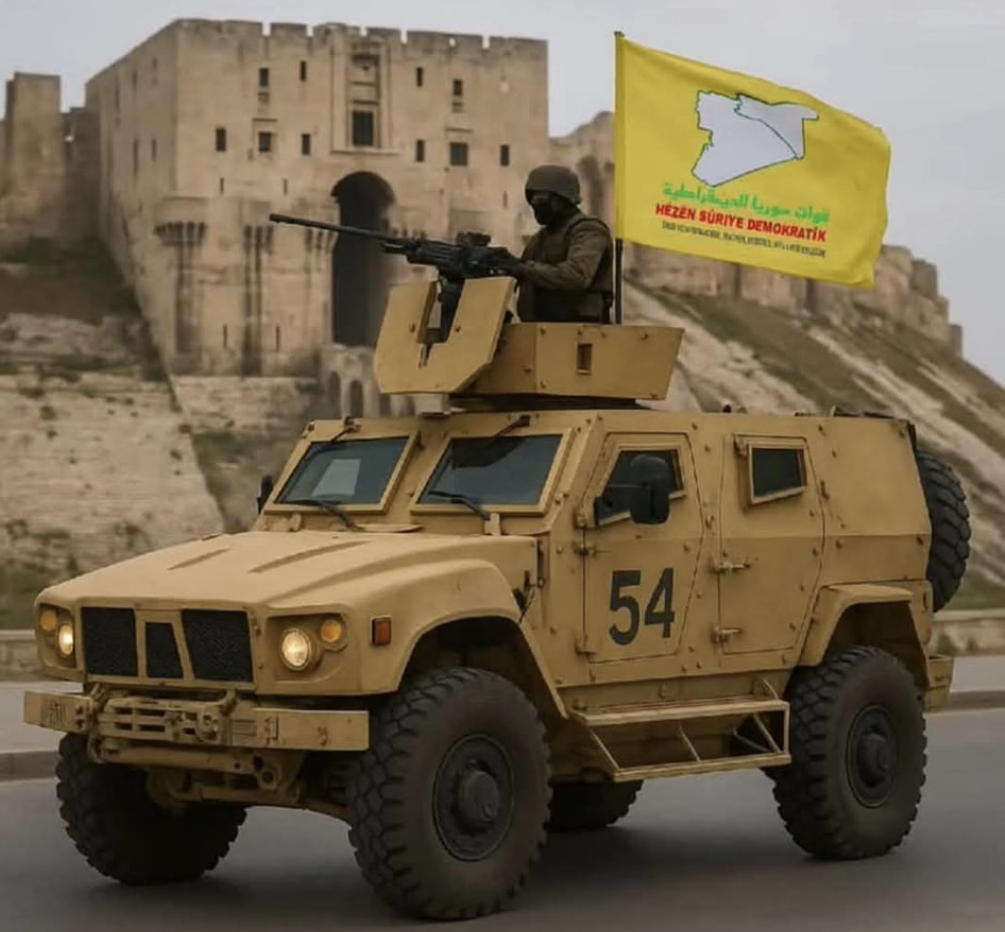 تداول بعض رواد مواقع التواصل الاجتماعي يوم 29/05/2025 صورة تُظهر مدرعة حربية تحمل علمًا عليه شعار “قوات سوريا الديمقراطية”، وتقف أمام قلعة حلب.