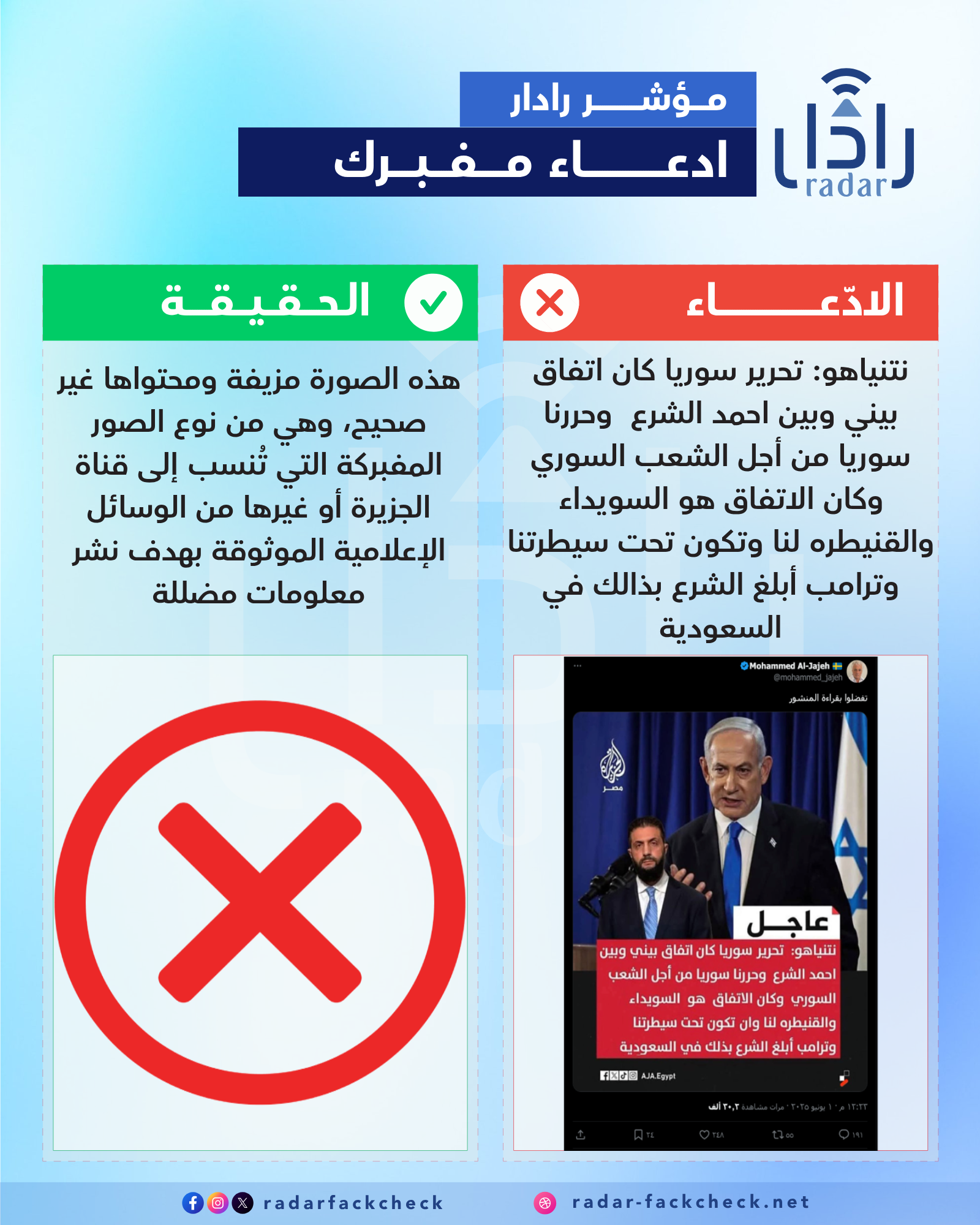 دقق فريق منصة رادار الصورة المرفقة ومن خلال البحث لم يتم العثور عليها في معرفات قناة الجزيرة، ومن خلال فحصها تبين أن هذه الصورة مزيفة ومحتواها غير صحيح، وهي من نوع الصور المفبركة التي تُنسب إلى قناة الجزيرة أو غيرها من الوسائل الإعلامية الموثوقة بهدف نشر معلومات مضللة وغايتها إشعال الفتنة . الدلائل على فبركة الصورة: 1. التصميم والأسلوب: الخط المستخدم في النص يختلف عن الخط الرسمي لتصميمات قناة الجزيرة. التنسيق غير احترافي، مثل وضع الكلمات بطريقة غير متناسقة. 2. المنطق والمحتوى: من غير المعقول أن يدلي رئيس وزراء إسرائيل (نتنياهو) بتصريح بهذه الطريقة عن "تحرير سوريا" والاتفاق مع شخص غير معروف رسميًا مثل "أحمد الشرع". الحديث عن "السويداء والقنيطرة لنا" و"تحت سيطرتنا" كلام مثير للسخرية ويهدف للاستفزاز، وليس أسلوبًا سياسيًا دبلوماسيًا. 3. التحقق الإعلامي: لا توجد أي مصادر موثوقة أو تقارير من قناة الجزيرة أو غيرها نشرت هذا التصريح. قناة الجزيرة لديها حساب رسمي يمكن التحقق منه على فيسبوك أو على موقعها الرسمي.