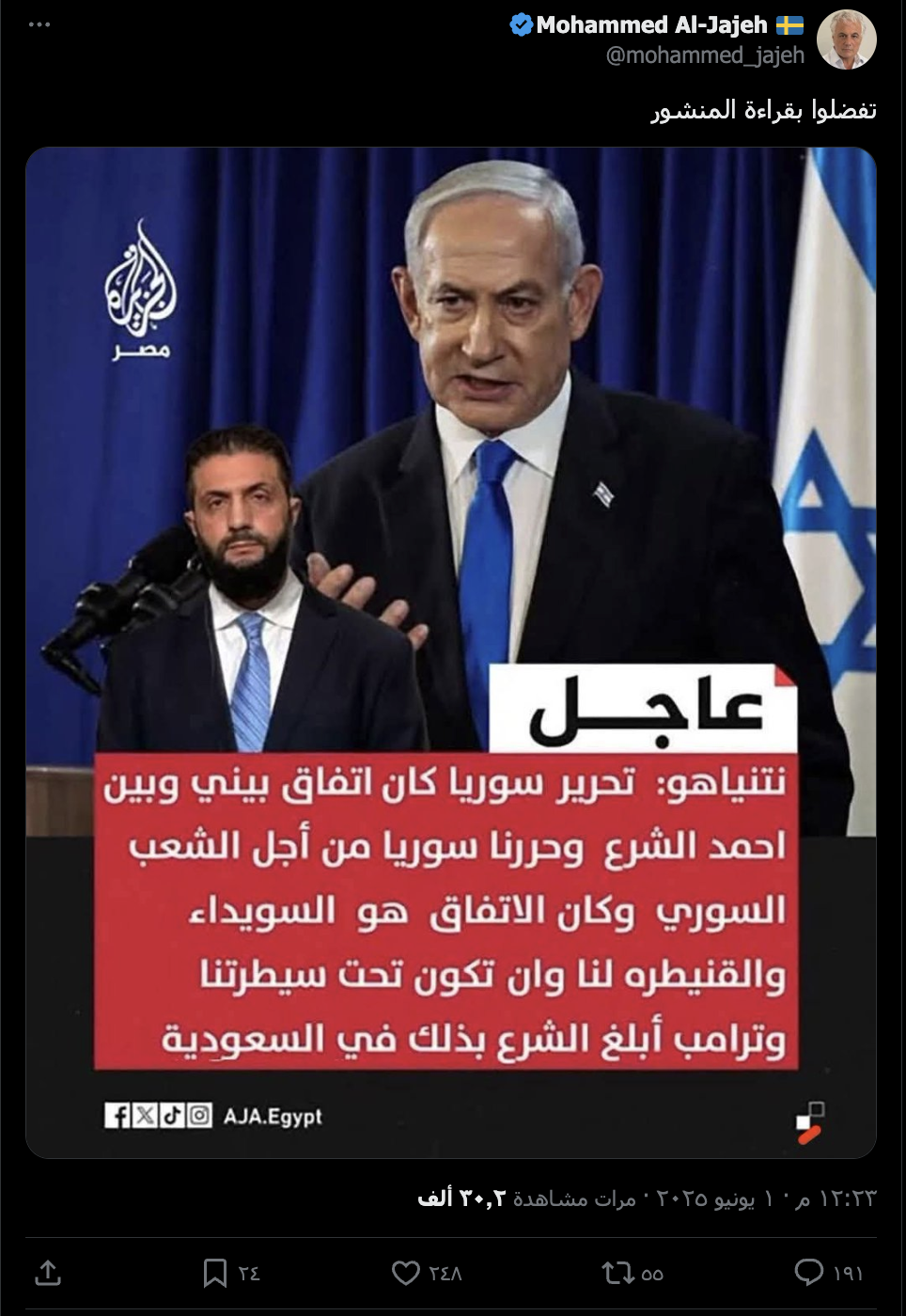 انتشر على مواقع التواصل الاجتماعي ادعاء مفاده أن نتنياهو قال: تحرير سوريا كان تفاق بيني وبين احمد الشرع وحررنا سوريا من أجل الشعب السوري وكان الاتفاق هوه السويداء والقنيطره لنا وا تكون تحت سيطرتنا وترامب أبلغ الشرع بذالك في السعودية.