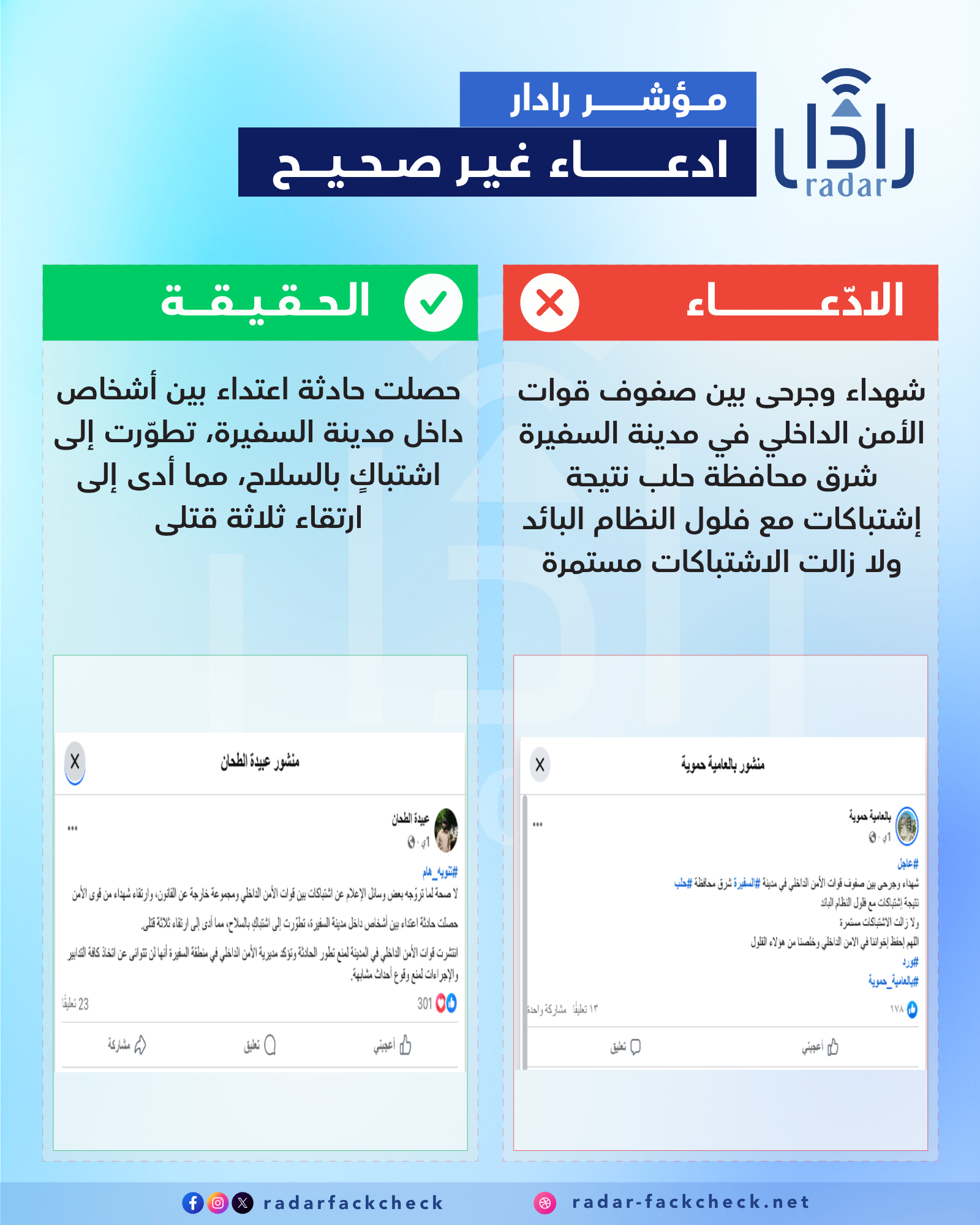 تحقق فريق منصة رادار من هذه الادعاءات من خلال المصادر المفتوحة وتبين أن الادعاءات غير صحيحة، حيث حدثت الاشتباكات بين أشخاص في مدينة السفيرة لا ينتمون لأي جهة عسكرية او مجموعات خارجة عن القانون أو فلول للنظام, وبدروها أكدت مديرية الأمن في منطقة سفيرة أنه لا صحة لما تروّجه بعض وسائل الإعلام عن اشتباكات بين قوات الأمن الداخلي ومجموعة خارجة عن القانون، وارتقاء شهداء من قوى الأمن، وحصلت حادثة اعتداء بين أشخاص داخل مدينة السفيرة، تطوّرت إلى اشتباكٍ بالسلاح، مما أدى إلى ارتقاء ثلاثة قتلى. انتشرت قوات الأمن الداخلي في المدينة لمنع تطور الحادثة وتؤكد مديرية الأمن الداخلي في منطقة السفيرة أنها لن تتوانى عن اتخاذ كافة التدابير والإجراءات لمنع وقوع أحداث مشابهة.