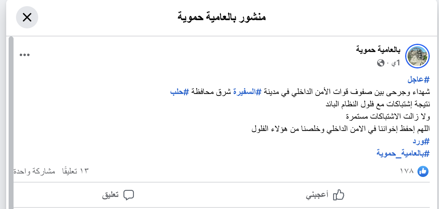 شهداء وجرحى بين صفوف قوات الأمن الداخلي في مدينة السفيرة شرق محافظة حلب نتيجة إشتباكات مع فلول النظام البائد ولا زالت الاشتباكات مستمرة.