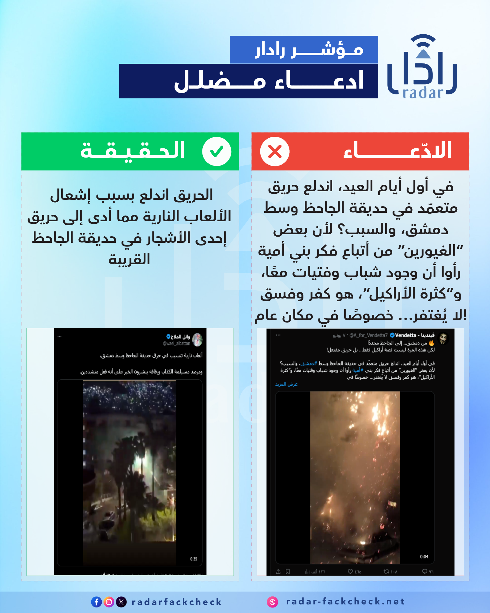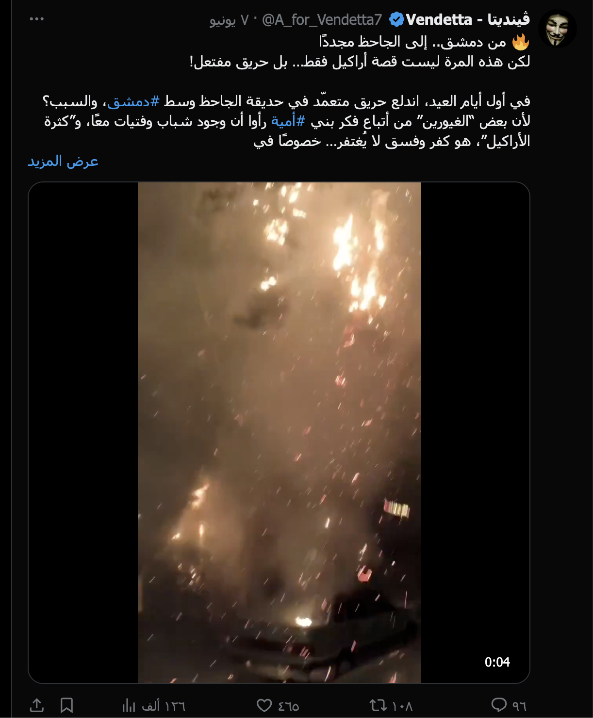 تداول ناشطون عبر وسائل التواصل الإجتماعي السبت 7 حزيران 2025 فيديو يظهر حريقآ في حديقة الجاحظ وسط دمشق، الناشطون على منصة الاكس قالو أن الحريق كان مفتعلآ من قبل أتباع فكر بني أمية ،وأنهم قد رأوا أن وجود شباب وفتيات مع وجود الأراكيل في مكان عام هو كفر وفسق لايغتفر بالإضافة إلى قولهم أن الحديقة لم تُغلق بل أُحرقت بنيران الجهل بإسم “الفضيلة ” و “الغيرة الدينية “.