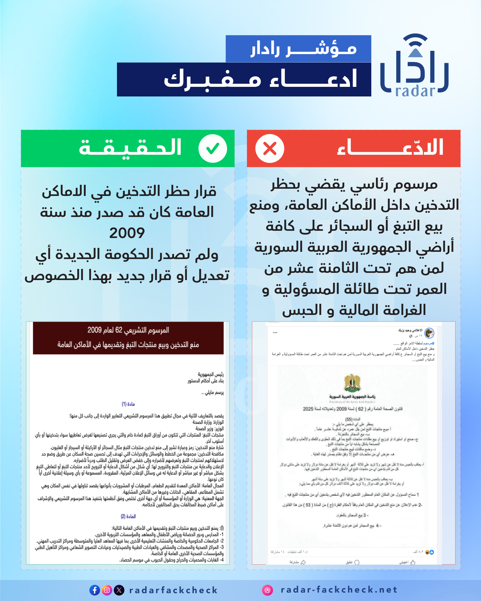 أجرى فريق منصة رادار تدقيقا للمرسوم المتداول، وتبين أنه مفبرك لما يحتويه من عدم تناسق بالخطوط وكتابة النص بشكل عشوائي دون ترتيب، وحيث أن قرار منع التدخين في الاماكن العامة كان قدر صدر عام 2009 بمرسوم تشريعي رقم 62، يحتوي على 22 مادة تشمل حظر التدخين والعقوبات.