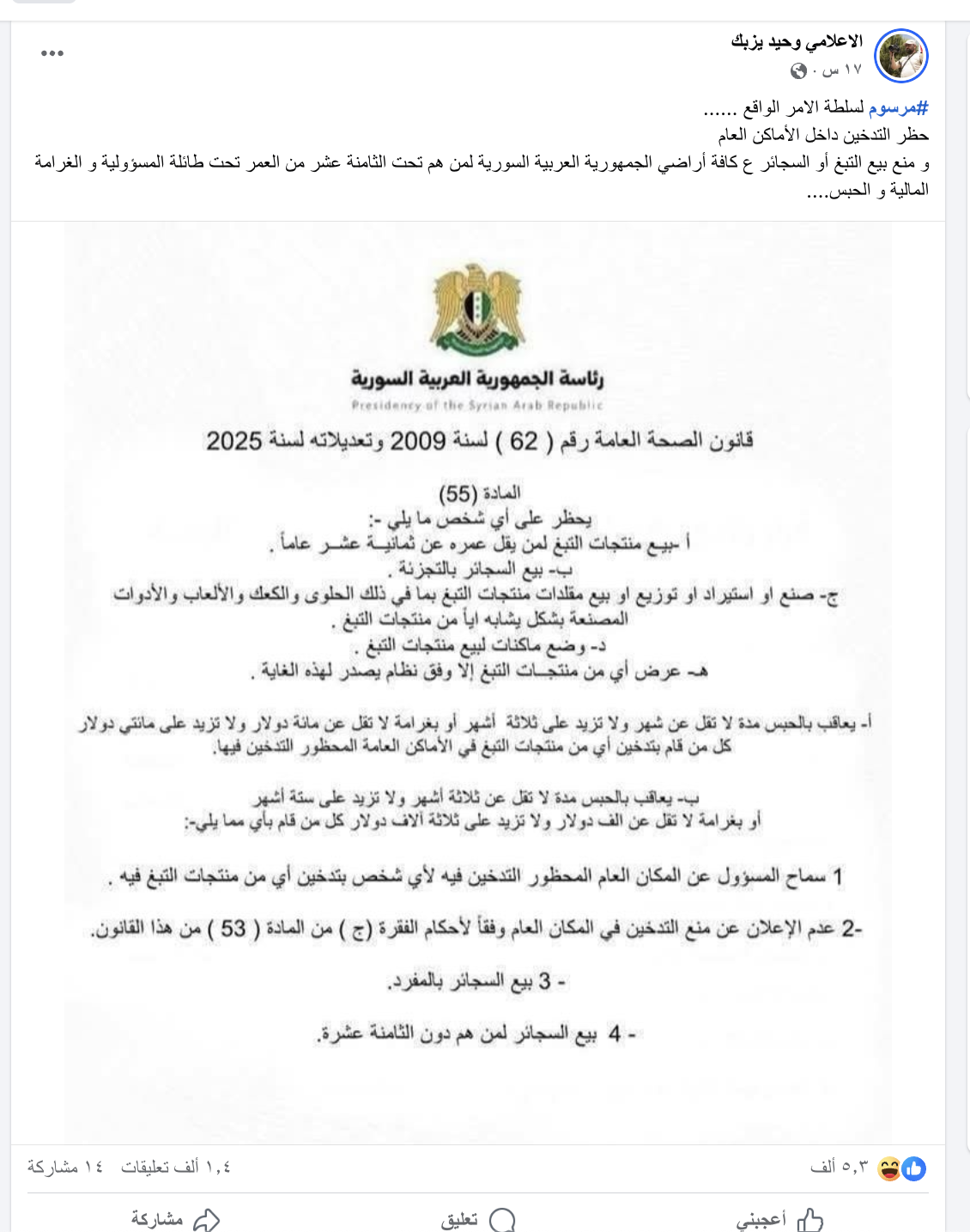 تداولت صفحات على منصة فيس بوك مرسوم رئاسي يقضي بحظر التدخين داخل الأماكن العامة، ومنع بيع التبغ أو السجائر ع كافة أراضي الجمهورية العربية السورية لمن هم تحت الثامنة عشر من العمر تحت طائلة المسؤولية و الغرامة المالية و الحبس.
