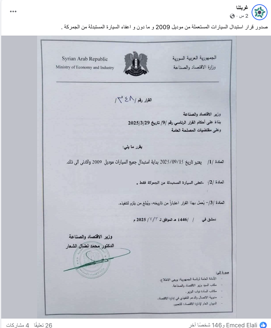 تداولت صفحات على وسائل التواصل الاجتماعي، اليوم، صورة لقرار رسمي منسوب لوزارة الاقتصاد السورية، يحمل الرقم 348، ويزعم أنه ينص على بدء استبدال السيارات من موديل 2009 وما دون، مع إعفاء السيارة المستبدلة من الجمارك بشكل كامل.