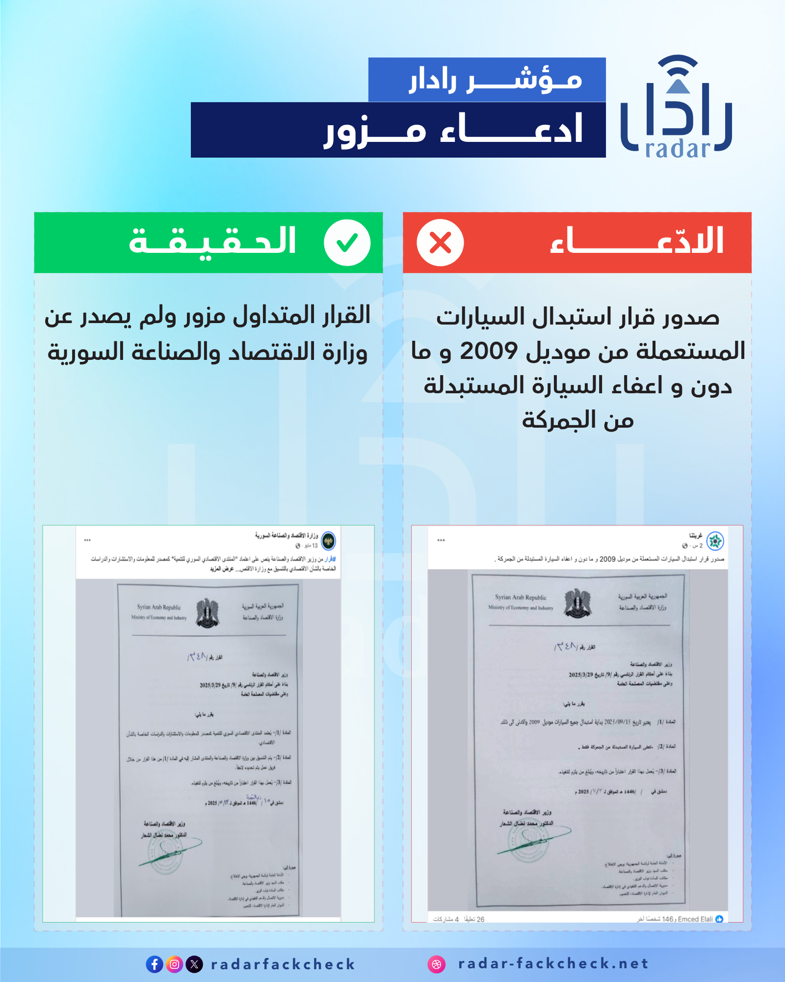 أجرى فريق رادار تحققًا من صحة القرار المتداول، من خلال الرجوع إلى مصدر القرار الأصلي المنشور على الصفحة الرسمية لوزارة الاقتصاد و الصناعة ، ومقارنة الوثيقة المتداولة بنسخة القرار الحقيقية، ليتبيّن أن القرار صحيح من حيث الرقم والتاريخ والتوقيع، لكنه لا يتضمن أي إشارة إلى السيارات أو الإعفاء الجمركي. إذ نص القرار رقم 348، الصادر بتاريخ 29 آذار/مارس 2025، على اعتماد المنتدى الاقتصادي السوري للتنمية كمصدر للمعلومات والاستشارات والدراسات الاقتصادية، ولا علاقة له على الإطلاق بموضوع استبدال السيارات أو الإعفاء من الرسوم الجمركية. وبناءً عليه، فإن الصورة المتداولة تم تحريف مضمونها، مع الحفاظ على الشكل والتوقيع لتبدو رسمية، ما يجعلها وثيقة مزوّرة في المحتوى، وتهدف إلى تضليل الجمهور بنشر معلومات كاذبة منسوبة لجهات رسمية.
