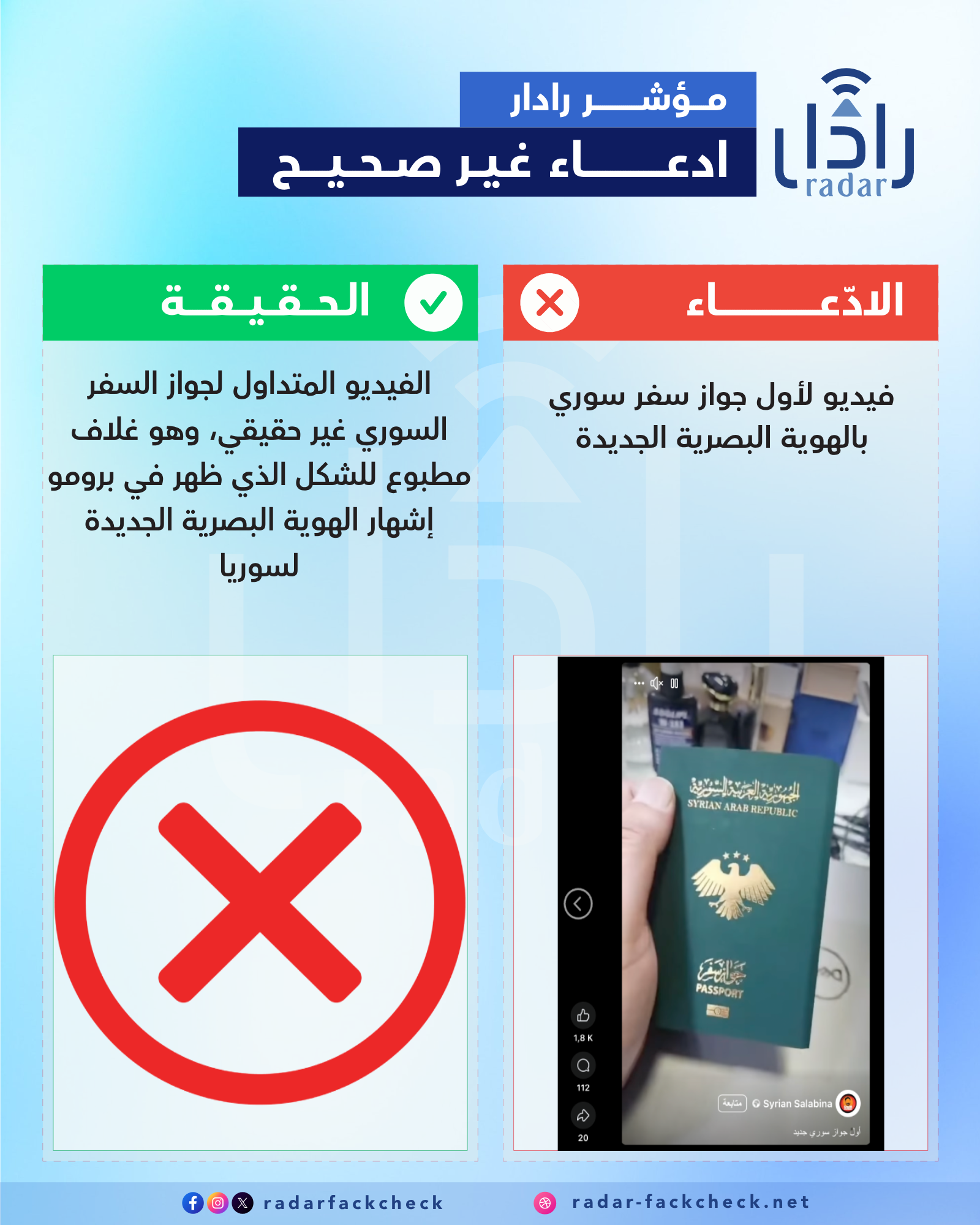 أجرى فريق منصة رادار بحثاً دقيقاً في المصادر الحكومية السورية، ولم يعثر على أي معلومة أو خبر يؤكد إصدار أو طباعة أي جوازات سفر جديدة، ولم تعلن أيضا الحكومة موعد البدء بعمليات إصدار جوازات السفر أو الهويات أو العملة السورية الجديدة.