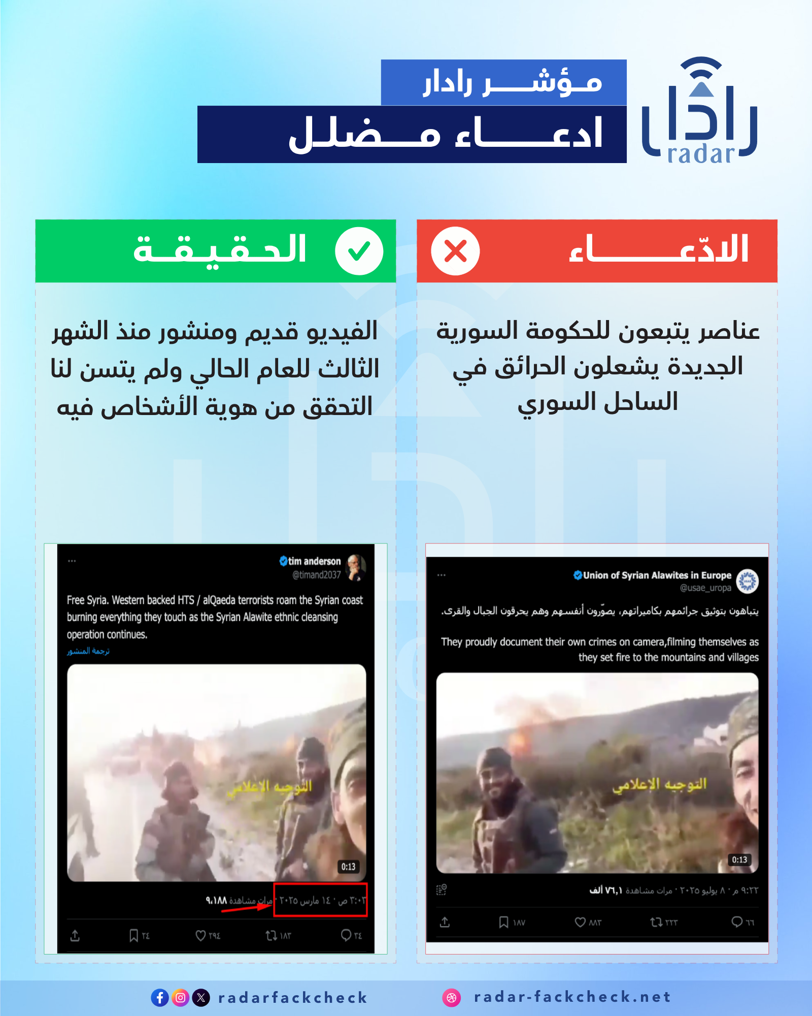 تداولت حسابات على وسائل التواصل الاجتماعي خلال الساعات الماضية مقطع فيديو يظهر عناصر عسكرية وخلفهم مشهد لحرائق مشتعلة، مع ادعاء بأنهم عناصر تابعة للحكومة السورية وأنهم يصوّرون أنفسهم أثناء إشعال النيران في الجبال والقرى.