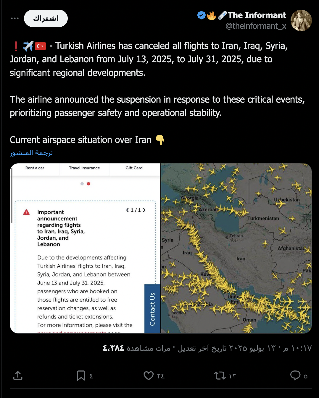 انتشر مؤخراً على وسائل التواصل الاجتماعي ادعاءاً مفاده، أن الخطوط الجوية التركية ألغت جميع رحلاتها إلى كل من ايران والعراق وسوريا والأردن حتى نهاية الشهر الحالي.