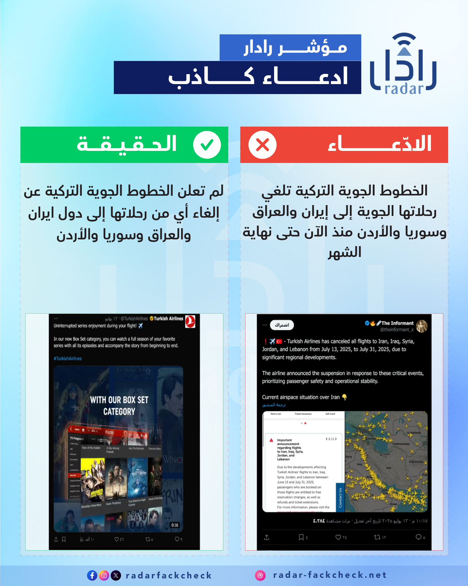 بحث فريق منصة رادار عن صحة الادعاء، وتبين أنه ادعاء كاذب لا أساس له من الصحة، ولم تعلن الخطوط الجوية التركية عن إلغاء أي رحلات جوية لدول ايران والعراق وسوريا والاردن. والتحذير الذي نشرته الخطوط الجوية التركية تم فهمه بشكل خاطئ، حيث تقصد الشركة أنه يحق لكل شخص تضرر سابقاً من الغاء رحلته لهذه الدول أن تغيير رحلته أو استرداد قيمة التذاكر، نتيجة التوتر الذي حصل سابقا بين اسرائيل وايران.