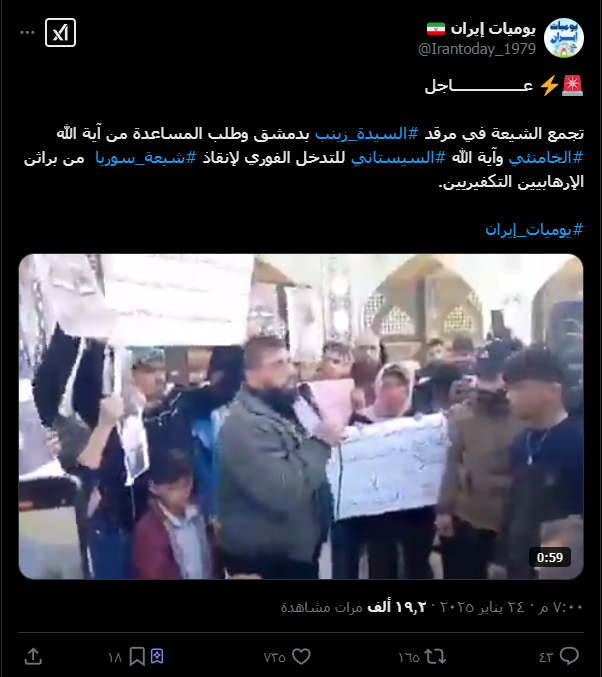 ادعت حسابات على مواقع التواصل الاجتماعي، أنه تجمع الشيعة في مقام السيدة زينب في دمشق، وطالبوا الخامنئي والسيستاني للتدخل الفوري لإنقاذ شيعة سوريا,