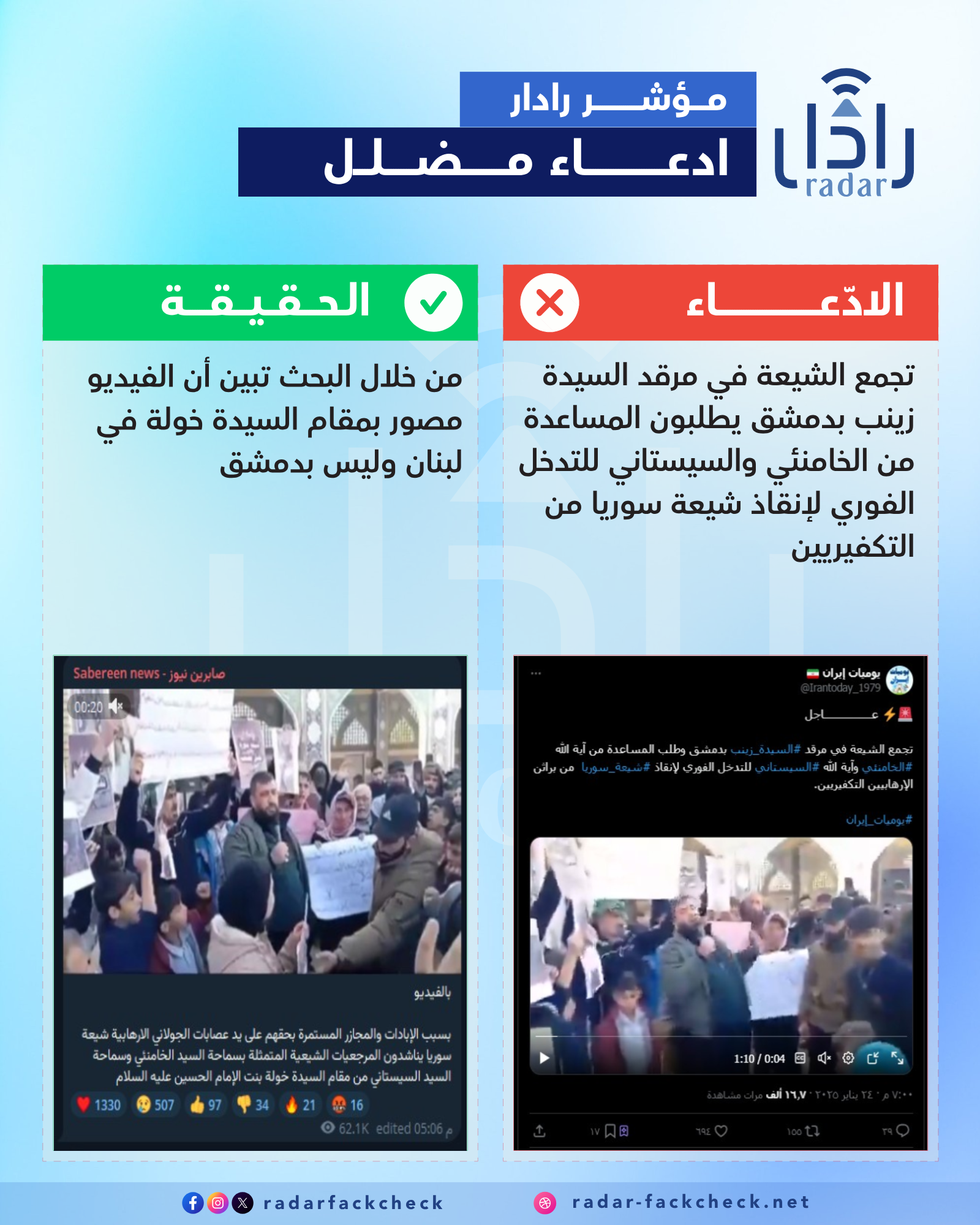 بحث فريق منصة رادار عن الفيديو، وبعد التحقق، تبين أنه مصور في مقام السيدة خولة بنت الحسين في لبنان، لتجمع شيعة سوريين ناشدوا المرجعيات الإيرانية لحمايتهم على حد وصفهم.