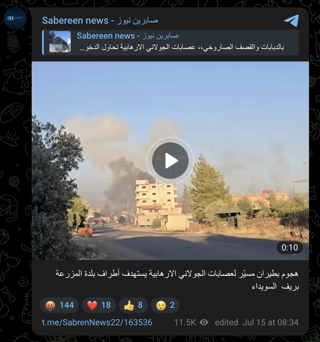 نشرت شبكة صابرين نيوز العراقية فيديو يظهر قصف قرب أحد المباني في محافظة السويداء، وادعت الشبكة أن الحكومة السورية قصفت بلدة المزرعة بريف السويداء بالطيران المسير.