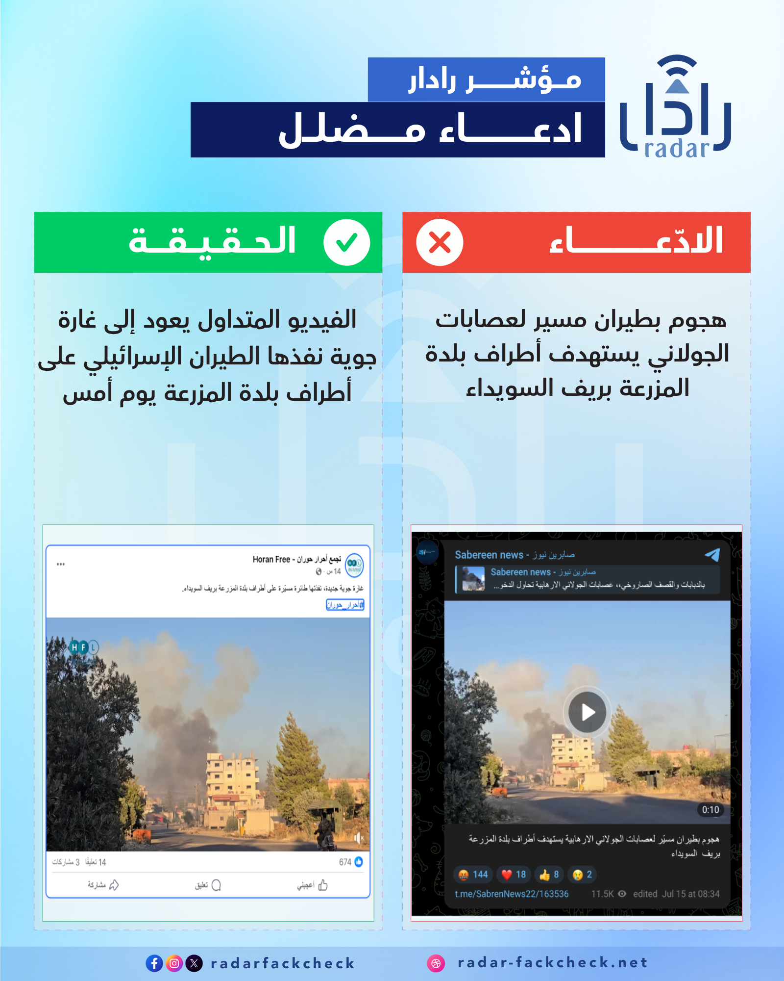 أجرى فريق منصة رادار تحقيقاً للفيديو المتداول، ومن خلال البحث، تبين أن الفيديو تم تصويره يوم أمس، لغارة جوية نفذها الطيران الإسرائيلي على أطراف بلدة المزرعة، أدت لمقتل شاب من محافظة درعا، حسب تجمع أحرار حوران.